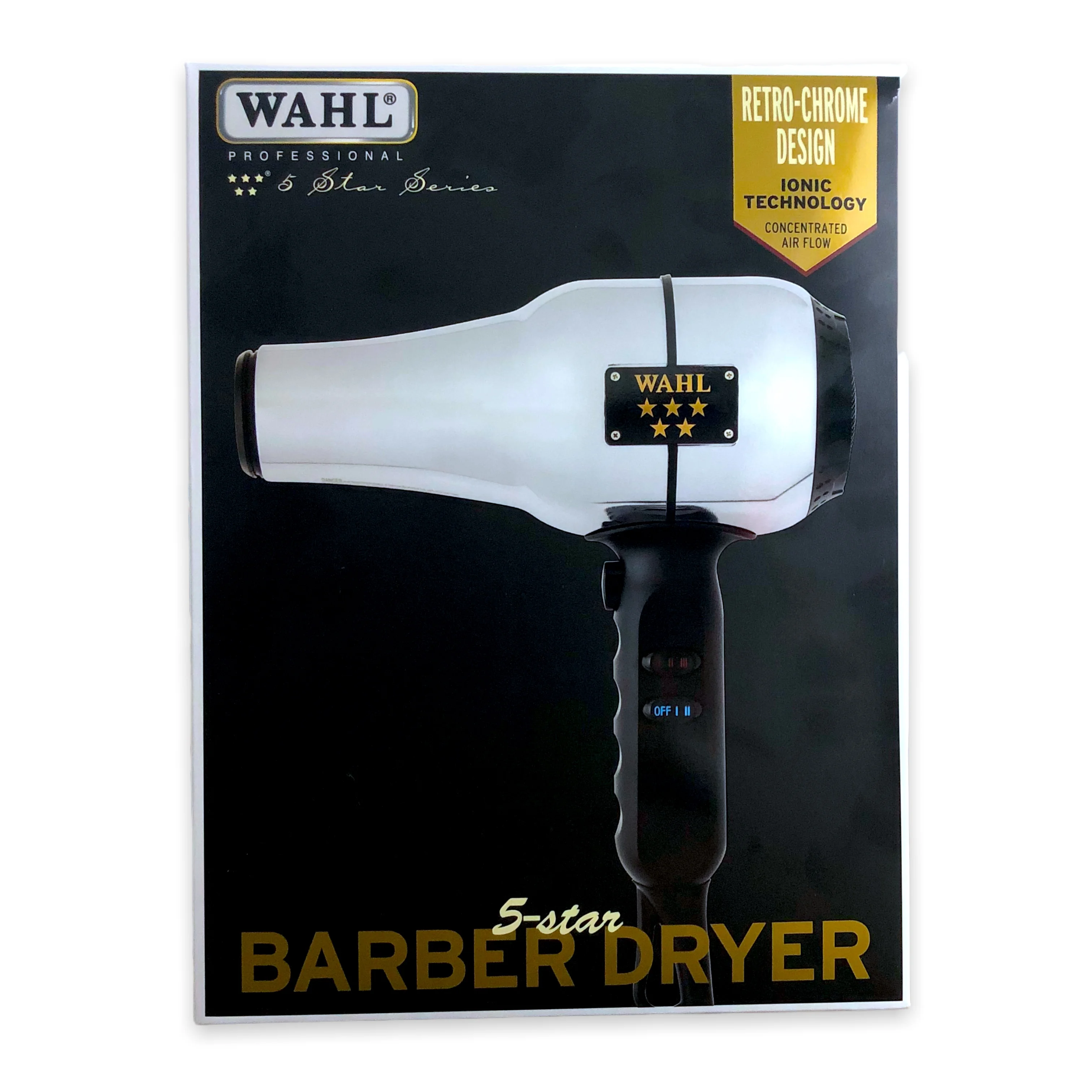 $68.79WAHL Professional 5 Star Barber Dryer #5054 has a concentrated airflow which enhances drying speed. Retro chrome design for the post-modern era, sleek and stylish. Ionic technology with tourmaline grill. Immediate cool shot effect for holding styles in place. Two heat settings and two-speed settings. The cord Length is 9 feet. Comes with two air-concentrating nozzles to adjust the strength and direction of airflow.