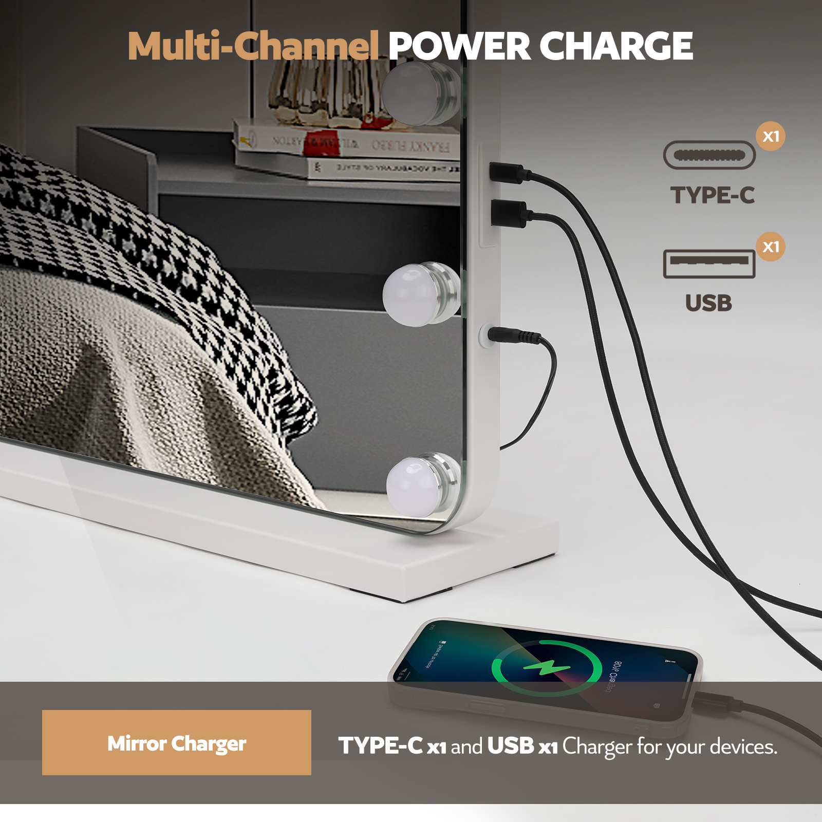 $102.59WLRETMCI Vanity Mirror with Lights and Bluetooth—a must-have for your beauty routine. This Hollywood Vanity Mirror is a large size (31.4″ x 24.4″) and comes with Bluetooth. And you are able to connect your phone via Bluetooth and listen to music while doing makeup, which is really convenient.The makeup mirror with 17 LED bulbs, this Hollywood vanity mirror illuminates your space with flawless lighting. 3 color lighting modes to customize your makeup experience to perfection. Product :Large Vanity Makeup Mirror with Bluetooth and Type-C USB Port Frame: Sturdy Metal Mirror Material: Ivory white mirror Voltage Input: 110-230V Power Cord: 12V 2A Light: Cool white/ Warm white / Warm yellow Bulb: 17*LED dimmable bulbs Base: Detachable base Mounting Type: Tabletop, Wall Mount