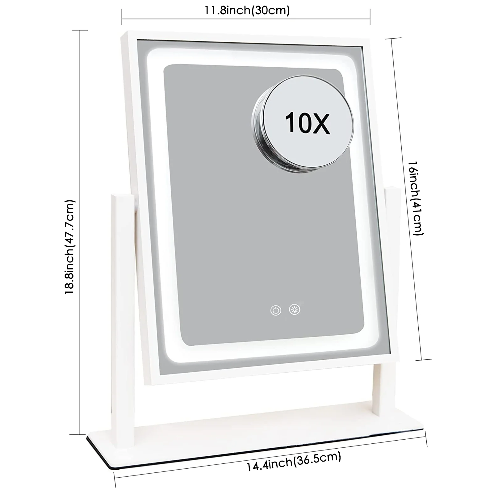 YUOY Vanity Mirror with LED Lights and 10x Magnifying Mirror, Tabletop Lighted Makeup Mirror, Extra Large 18.8″*14.4″, White Metal