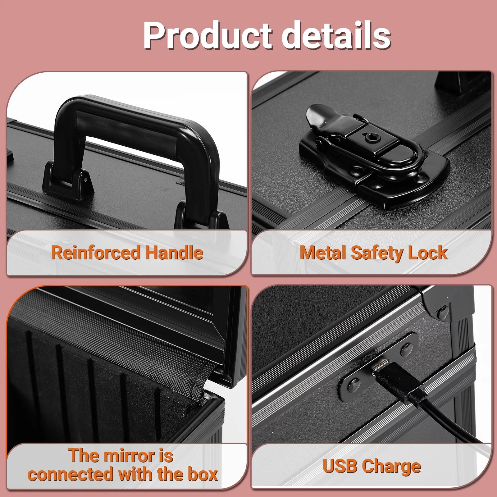 $55.89The best choice as a gift for her. Notice: Please charge the case before using. Specification: Brand: ZXMT – XHB Type: Makeup Case Makeup Case Size: 13.8 * 9.8 * 5.9 inch Jewelry Box Size: 5.7 * 3.9 * 3.1inch Light Count: 4 Led Lights Light Mode: 3000K ± 500K for evening skin care, 4500K ± 500K for morning makeup, 6500K ± 500K detailed skin care Number of Sponge Dividers: 5 Material: ABS Color: Black Features: 【Hold All Cosmetics】It can hold a large amount of cosmetics as well as makeup tools. 【Perfect For All Makeup Needs】This makeup train case comes with lights, makeup mirror, jewelry organizer and brushes board. 【The Best Choice As A Gift】Professional appearance and high practicality make this the best choice for her gift. 【Rechargeable, Full Charge for Running 8 hours】A full charge can keep it running for 8 hours. Package Includes: 1 x Makeup Case, 1 x Brush Storage, 1 x Jewelry Box, 1 x Key.