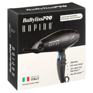 $128.13When you need performance in a hair dryer but want it to be lightweight, the Conair BaBylissPRO Rapido 2000-Watt Hair Dryer is the one for you. Dependable and efficient, it helps you to look your best. You’ll find that it delivers high performance yet is light and easy to hold while styling your hair. The 2000-watt dryer has a variety of heat and speed settings that enable you to get the salon look that you want. Enjoy your hair and avoid bad hair days. Whether you’re going to work, to the gym or to a party, you’ll feel more confident that your locks are looking good. This Conair hair dryer makes a practical holiday or birthday gift. Features & Benefits Hair dryer • Made in Italy • Super-lightweight dryer weighs significantly less than a pound! • 40% lighter than other dryers – When compared to our other professional dryers • Up to 50% faster drying – Based on higher air volume & pressure when compared to our DC motor dryers • Over 50% quieter operation – Compared to our other professional dryers of like performance without noise-reducing filter • Nano Titanium™ heat technology • Up to 10,000 hours at full power • 2000 watts • 6 heat/speed settings • Cold shot button • Includes 2 snap-in concentrator nozzles Diffuser • Snap-on finger diffuser • Lifts and separates hair • Creates soft, bouncy curls without frizz • Ideal for naturally wavy or permed hair