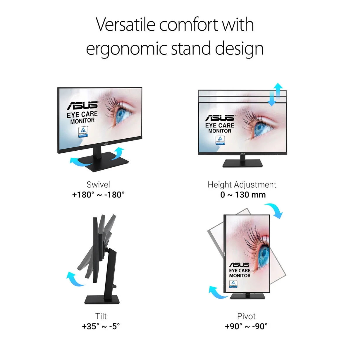 $122.63ASUS VA24EHE Eye Care Monitor – 23.8 inch, Full HD, IPS, Frameless, 75Hz, Adaptive-Sync, Low Blue Light, Flicker Free, Wall Mountable 23.8-inch Full HD (1920×1080) LED backlight display with IPS 178° wide viewing angle panel Up to 75Hz refresh rate with Adaptive-Sync technology to eliminate tracing and ensure crisp and clear video playback Extensive connectivity including HDMI and D-sub ports VESA wall-mountable to save on desktop space ASUS Eye Care monitors feature TÜV Rheinland-certified Flicker-free and Low Blue Light technologies to ensure a comfortable viewing experience Superior Image Quality Meets Classic Elegant Design ASUS VA24EHE Eye Care Monitor features 23.8 inch IPS panel with Full HD (1920 x 1080) resolution, providing 178° wide viewing angle panel and vivid image quality. Up to 75Hz refresh rate with Adaptive-Sync technology to eliminate tracing and ensure crisp and clear video playback. In addition, it also features TÜV Rheinland-certified Flicker-free and Low Blue Light technologies to ensure a comfortable viewing experience. Viewing Perfection Expanded vision with 178° IPS wide-viewing-angle panel, giving consistent, accurate color at any viewing angle to minimize the color shift an promise for a better viewing experience. Frameless Design Makes it perfect for almost-seamless multi-display setups that give you an even greater degree of immersion. Super smooth visuals with Adaptive-Sync Adaptive-Sync technology to eliminate screen tearing and choppy frame rates to give you seamless visuals and smooth gameplay. This gives you the upper hand in first person shooters, racing, real-time strategy and sports titles. (Adaptive-Sync works at fresh rates ranging from 48Hz to 75Hz) ASUS-exclusive GamePlus Technology When it comes to design, ASUS always has customers in mind – ASUS exclusive GamePlus hotkey with Crosshair, Timer, FPS counter and Display Alignment functions to give you in-game enhancements that help you get more out of your game. This function is co-developed with input from pro gamers, allowing them to practice and improve their gaming skills. ASUS-exclusive SplendidPlus Technologies Weve raised the bar by incorporating some of our proprietary technologies to give you a truly vivid visual experience. Splendid Video Intelligence Technology that optimizes videos and images by enhancing color brightness, contrast, and sharpness. Splendid features two new modes – Reading and Darkroom – in addition to the Scenery, Standard, Theater, sRGB, and Night View modes. Low-blue Light and Flicker-free technologies also reduce the strain on your eyes after long periods of use. Protect your eyes with ASUS Eye Care Technology ASUS Blue Light Filter The TÜV Rheinland-certified ASUS Blue Light Filter protects you from harmful blue light, and you can easily access its four different filter settings via a hotkey. ASUS displays has undergone stringent performance tests and has been certified by TÜV Rheinland laboratories, a global provider of technical, safety, and certification services, to be flicker-free and to emit low blue light levels Flicker-free Technology Its time to say goodbye to those tired, strained eyes. ASUS displays features TÜV Rheinland-certified ASUS Flicker-Free technology to reduce flicker for a comfortable viewing experience. This technology helps minimize instances of eyestrain and other damaging ailments, especially when you spend long, countless hours in front of a display watching favorite videos.