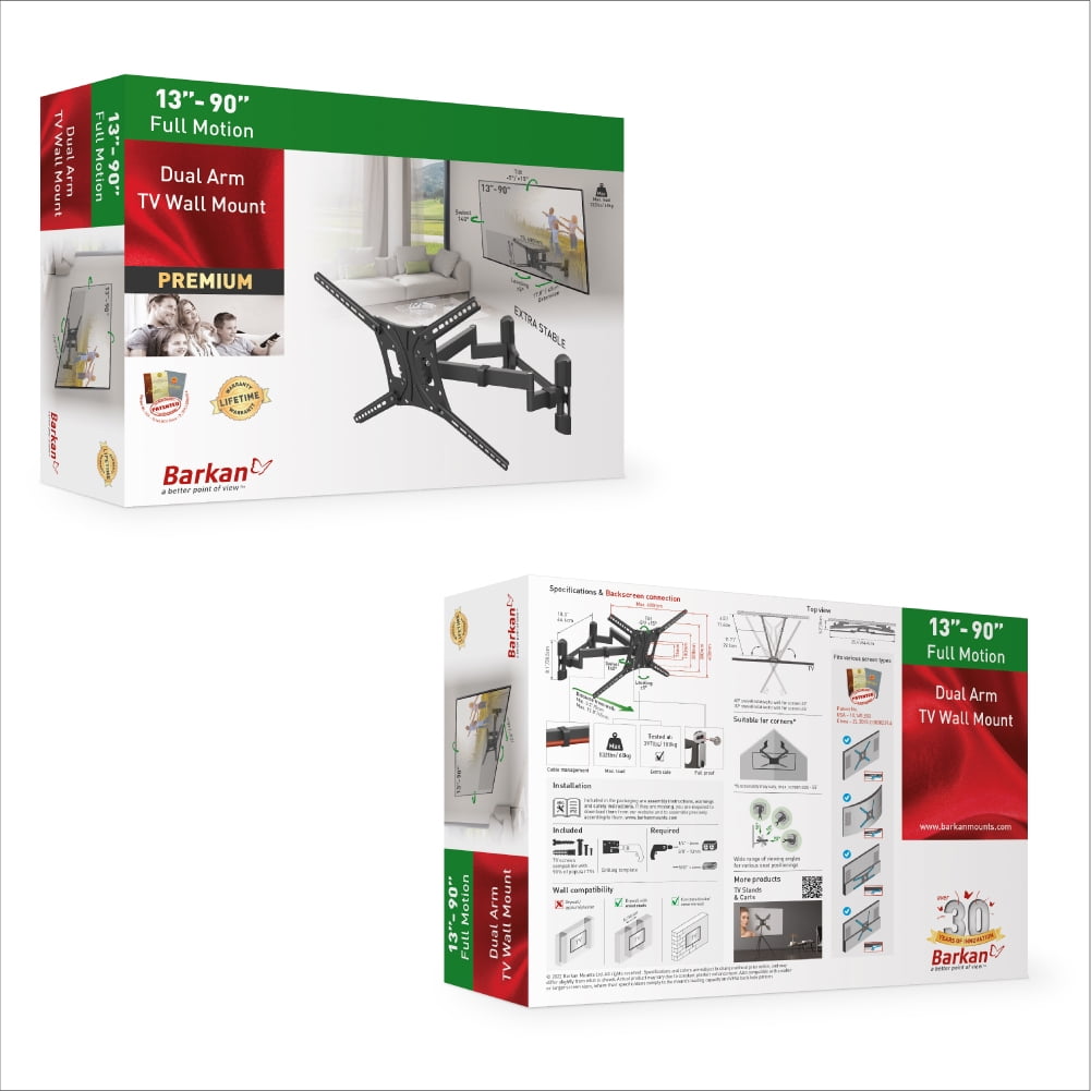 $77.39The Barkan full motion, four movement TV mount with rotate, fold, swivel and tilt options fits flat / curved screens sizes 13 90 inches and weight up to 132 lbs. The mount is extremely stable with two strong arms and an extra wide wall plate. The minimum distance between the mount and the wall is only 3.2 in. therefore allows low profile mounting. The maximum distance is 17.8 in. It fits TVs with VESA standard (Bracket Mounting Holes Patterns) 75×75, 100×100, 200×100, 200×200, 300×300, 300×400, 400×300, 400×400, 600×400 mm and non VESA up to 600×400 mm. In order to offer a better point of view, the mount has three pivots: near the wall 180 degrees, foldable 360 degrees, swivel near the screen connection plate 120 degrees and also tool free tilt from 5 till 15 degrees. The mount has a lifetime warranty and its color is black. Please check the list of included screen connection screws in the assembly instructions.