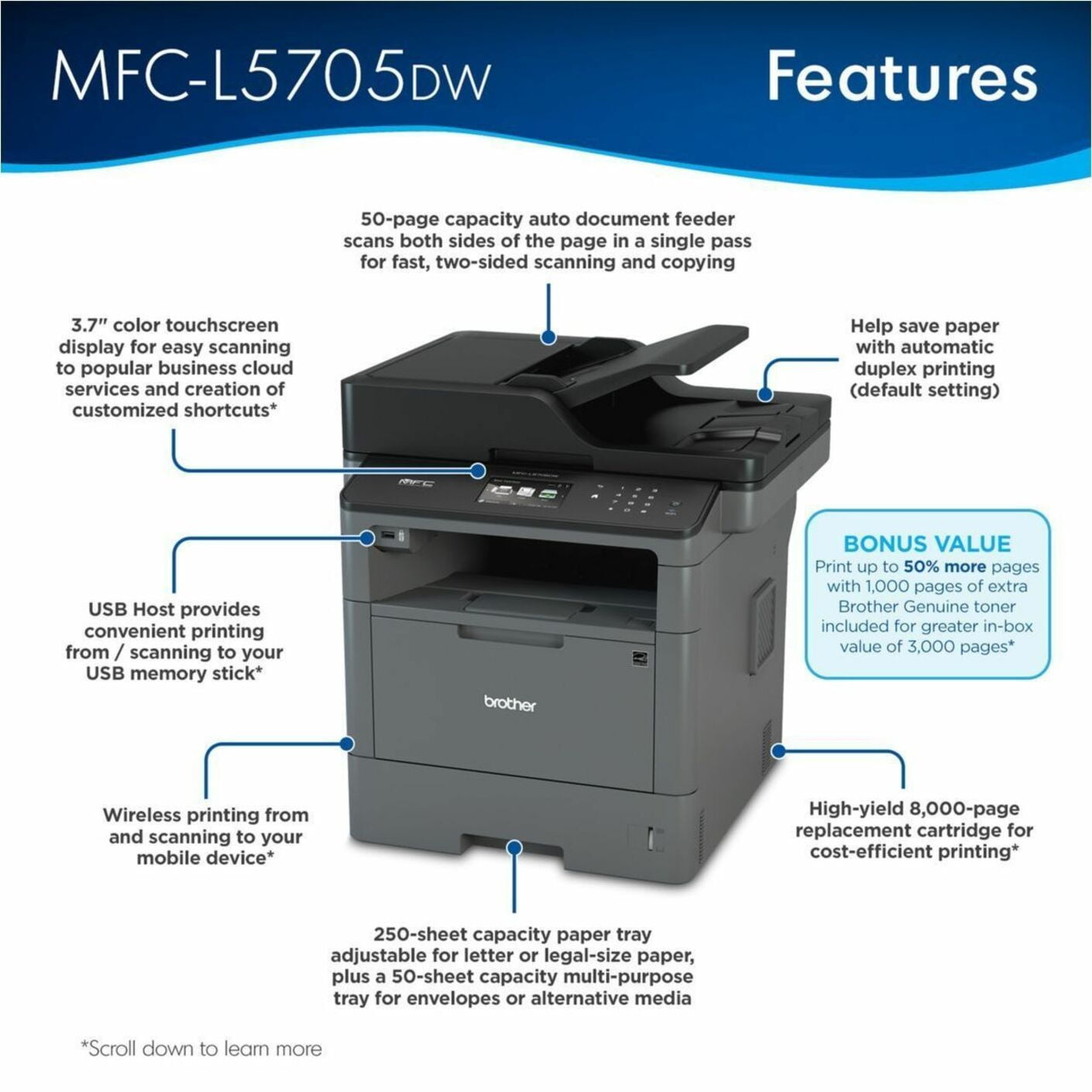 $388.88The Brother MFC-L5705DW monochrome laser all-in-one printer is a great choice for offices and small workgroups with higher print volumes, that need cost-efficient printing, easy scanning, secure document handling, and reliable, business-quality output. This high-performance multifunction printer offers greater in-box value with 3,000 pages of toner included (1). The printer can help increase productivity with fast printing up to 42ppm(2) and fast, two-sided scanning. Flexible paper handling includes the ability to expand to a 1,340-sheet total capacity with optional trays. Help minimize paper refills with a 250-sheet capacity paper tray that adjusts for letter or legal paper. Equipped with advanced security features to help limit document and device access and protect against network intrusions. 3.7” color touchscreen display allows for the creation of up to 48 shortcuts to help streamline workflows. Offers flexible connectivity with standard Ethernet or wireless networking and convenient printing from mobile devices (3).
