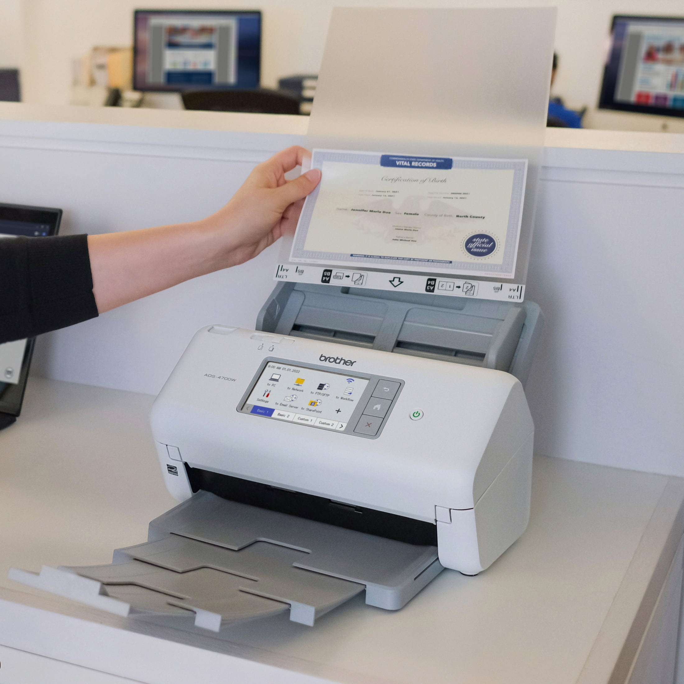$472.99The Brother ADS-4700W Professional Desktop Scanner is an essential component of an optimized fleet for the way work now works – providing easy integration with existing workflows, versatile scan-to destinations, and improved productivity. Equipped with fast, two sided scanning up to 40ppm1 to help maximize workgroup productivity. Quickly scan stacks of paper with various sizes and weights via the 80-page capacity auto document feeder to help optimize efficiency and productivity. The 4.3” color touchscreen display offers easy menu navigation and the ability to create up to 56 customizable shortcuts for one-touch scanning to multiple destinations and scan job preview. Offers Triple Layer Security features to help limit document and device access and protect against network intrusions. Provides wide driver support (TWAIN, WIA, ISIS, and SANE) for compatibility with existing software applications and document management systems. Enables scanning to variety of cloud applications2 including Google Drive™, Dropbox, and OneDrive, as well as email, SharePoint, SSH Server (SFTP), USB memory stick, and more, for easy collaboration. Equipped with a powerful bundled software suite to create, edit, and convert scanned documents into a wide variety of file formats including Searchable PDFs, Secure PDFs, Word, Excel, and PowerPoint. Maximize output quality with integrated image optimization features, such as Auto Deskew, Auto Image Rotation, and Bleed-through Removal. Features built-in wireless and Ethernet network interfaces to easily set up and share on your wired or wireless network. Ideal for busy offices and workgroups, scan-to your mobile device3 with AirPrint® and Brother Mobile Connect. The ADS-4700W is also ENERGYSTAR® compliant and EPEAT® Silver rated, making it an energy-efficient choice for your document capture needs. Includes a three-year standard limited warranty for peace of mind, as well as free online, live chat, or phone technical assistance for the life of your product.