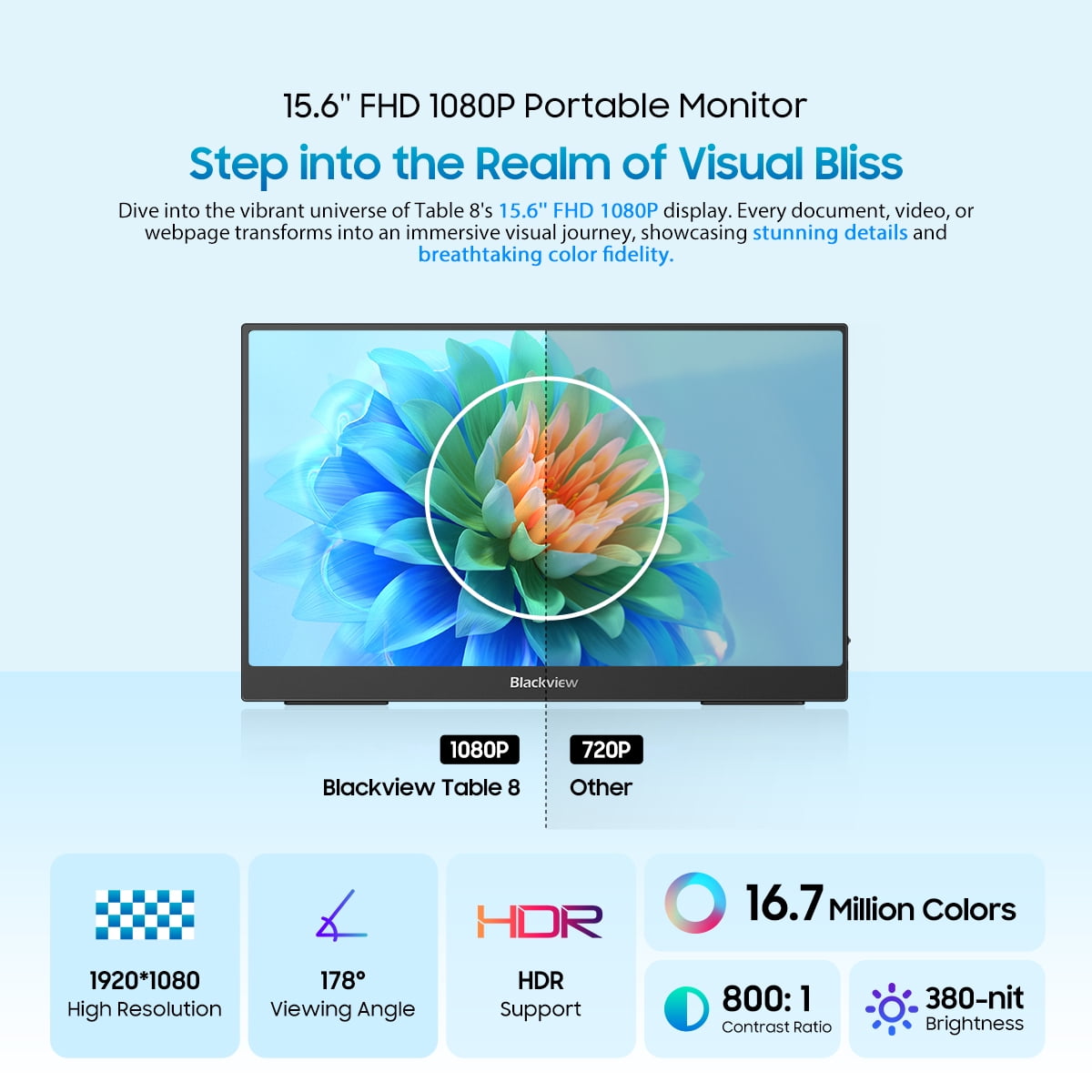 $61.91Blackview Table 8 15.6 inch Portable Monitor: Your on-the-go display solution! This sleek monitor offers a Full HD 1920×1080 resolution in a slim, 6mm design. Enjoy stunning visuals in both landscape and portrait modes. Connect easily to laptops, game devices, or smartphones with Type-C, mini HDMI, and a headphone jack. With 380 brightness, HDR, and anti-blue light, your eyes stay safe and visuals stay vibrant. Dual speakers provide great sound, making this monitor perfect for work, gaming, or entertainment on the move. Lightweight and stylish, the Table 8 is your perfect travel companion!