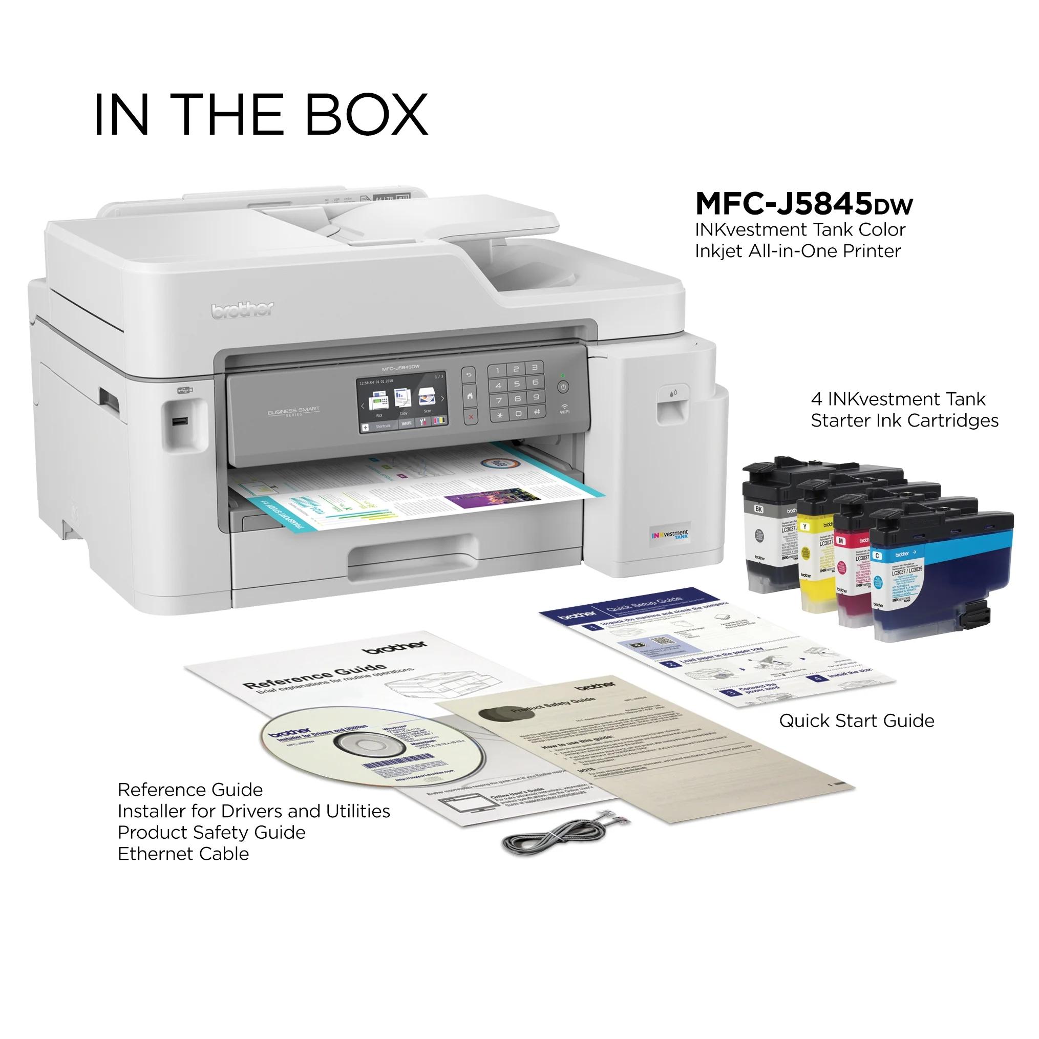 $515.99The Brother MFC-J5845DW INKvestment Tank color inkjet all-in-one printer with tank technology delivers reliable performance, enhanced productivity and professional results perfect for small businesses and home offices. The MFC-J5845DW features reengineered INKvestment Tank cartridges along with an internal ink storage tank to deliver uninterrupted printing for up to 1-year(1) without the need to purchase ink. Business-capable features include mobile device printing(2), flexible paper handling options, 11″ x 17″ printing, automatic two-sided printing and easy onscreen navigation using the 3.7″ color touchscreen. The Brother INKvestment Tank all-in-one printer with up to one-year of ink in-box(1) provides truly uninterrupted printing, exceptional features, super convenience, large page yields and low-cost printing. Includes a two-year limited warranty with free online, call, or live chat support for the life of your printer.