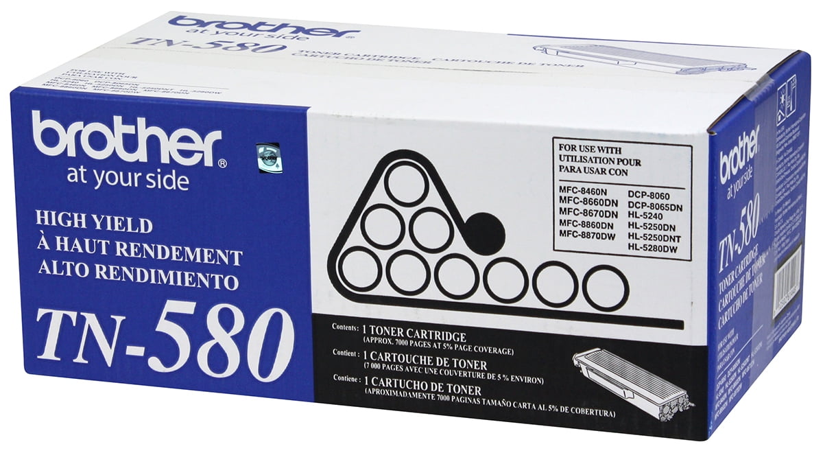 $92.02Keep prints looking pristine by using this Brother TN580 high-yield black toner cartridge. Enjoy quality print results with this high-yield black toner cartridge. The Brother TN580 high-yield black toner helps text look crisp and sharp for easy readability, and the cartridge is simple to install in select Brother machines, so you can get started printing in no time. This Brother black toner cartridge has a yield of up to 7,000 pages*, making it a great choice for large businesses with extensive printing jobs.