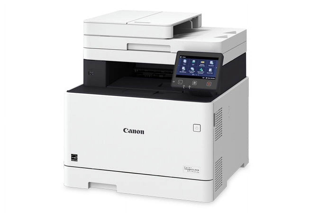 $360.34Canon Color imageCLASS MF641Cw ‐ Multifunction Wireless Color Laser Printer About this item 5-inch, Color Touch Panel: Easy to Use and customizable with Application Library Brilliant and Bold Color Output: V2 (Vivid and Vibrant) Color Technology produces high-quality prints by increasing image sharpness and color vibrancy Includes 3-Year Limited Warranty: 100% U.S. Based Service and Support team provides friendly, expert help for every level of experience Easily connect your mobile devices without a router using Wi-Fi® Direct Connection Print at speeds of up to 18 pages per minute, with your first print in approximately 10.3 seconds or less Description Usability A unique, customized device experience with Application Library. 5″ intuitive color touchscreen with smartphone-like usability. Create Wi-Fi® Direct hotspot from the printer to establish direct connection to mobile device(s) without the need for external router. Security Features Helps mitigate risk of confidential information loss as documents are only stored in short-term memory. Security settings can be set behind an administrator log-in. Cost Efficiency High-capacity, all-in-one cartridge helps reduce overall supply costs. Workflow Efficiency Supports mobile solutions for printing and scanning. Scan and convert documents to searchable digital files through the simplex document feeder. Designed for small print jobs with first-print time as fast as 10.3 seconds. Quality and Reliability Canon’s signature reliability and engine technologies help keep productivity high and minimize the impact on support resources. Intuitive maintenance videos for common tasks like consumables replacement. Specifications Functions: Print, Scan, Copy, Send (Lite) Print Speed: Up to 18 PPM (Letter) Document Feeder: Simplex Automatic Document Feeder: 50 Sheets First Print Out Time: Approximately 10.3 Seconds (Black / Color, Letter) Print / Copy Resolution: Up to 600 x 600 dpi Scan Resolution: Up to 300 x 600, 600 x 600 dpi Print / Copy Memory: 1 GB (Shared) Printer Language: UFR II, UFR II‐LT Network Security: IP/MAC Address Filtering, IPSEC, TLS Encryped, Communication, SNMP V3.0, IEEE 802.1X(Wired Only), IPv6, SMTP Authentication, POP Authentication, POP Authentication before SMTP Connectivity: USB 2.0 x2 (Host), USB 2.0 x1 (Device) High‐Speed, 10/100/1000Base‐T Ethernet (Network), Wi‐Fi 802.11b/g/n, Wi‐Fi® Direct Connection Operating Systems: Windows 7/Windows 8.1/Windows 10/Windows Server/2008/Windows Server 2008 R2/Windows Server 2012/Windows Server 2012 R2/Windows Server 2016 / Mac OS X v10.9.5 (or later) Paper Capacity: 250‐Sheet Standard Cassette, 1‐Sheet Manual Feed Slot Min / Max Paper Size: Standard Cassette / Manual Feed Slot: 4.1 x 5.8 inches to 8.5 x 14 inches USB Direct Print: JPG, TIFF, PDF Display Panel: 5 inch, Color Touch LCD Print Volumes:150‐2,500 Pages Energy Consumption: Approx: 900 W (Max.), 10.5 W (Standby), .