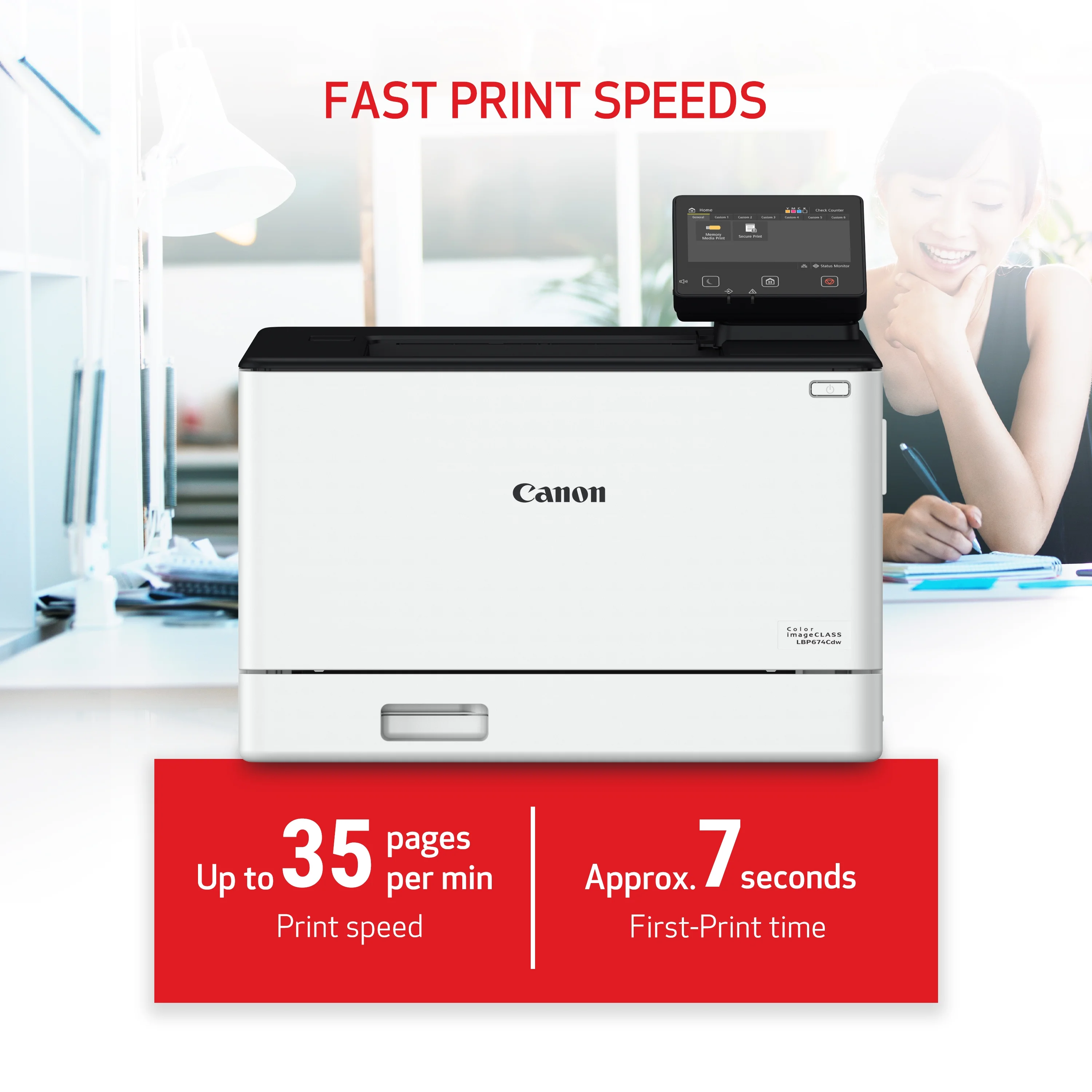 $616.89Designed for small and medium-size businesses, the imageCLASS LBP674Cdw model balances speedy performance and minimal maintenance. The LBP674Cdw is easy to set up and offers media versatility to print on a variety of media types and sizes, including envelopes, banners and more. The customizable, 5″ color touchscreen delivers an intuitive user experience.Produce crisp, colorful documents with fast print speeds of up to 35 pages per minute1, using high quality Canon Genuine Toner 069 / 069 H. Use Poster Artist Online to create professional-posters, banners and signage.The LBP674Cdw offers and expandable paper capacity of up to 850 sheets, with a plain paper capacity of up to 250 sheets, 50-sheet multipurpose tray, and optional cassette PF-K1 which holds up to 550 sheets.Easily connect and print through high-speed USB, Ethernet, or wirelessly from computers or mobile devices. Print using a variety of mobile apps, including the Canon PRINT Business app2 using your compatible mobile device.The LBP674Cdw comes with a 3-year limited warranty3 and is backed by Canon’s Service and Support network.