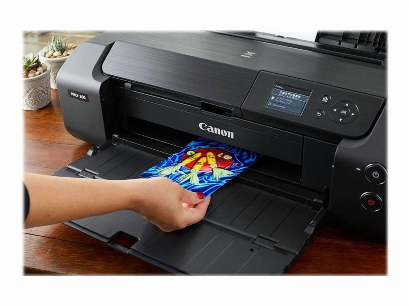 $695.74PIXMA PRO-200 The PIXMA PRO-200 Wireless Professional Inkjet Photo Printer is the ideal choice to bring your photos and designs to life in vibrant color. With an 8-color dye-based ink system, this versatile 13″ wide printer is designed to meet the demands of photographers and graphic artists alike. The PIXMA PRO-200 offers beautiful print quality, high-speed printing, and outstanding productivity in a compact footprint, allowing you to consistently produce the results your artistic work deserves. Bring your images to life with fast, professional quality print results. VIBRANT, TRUE COLORS With an 8-color dye-based ink system including two monochrome inks (gray, light gray), enjoy accurate color reproduction, richer colors, and vibrant professional printing, every time. FAST PHOTO PRINTING Increase your productivity through efficient high-speed printing. Produce a bordered A3+ print in just 90 seconds or a bordered 8×10 print in 53 seconds! ENHANCED COLOR GAMUT ChromaLife100+ CLI-65 ink is specially formulated for enhanced color gamut in magenta and reds, deeper black expression, and improvement of dark color reproduction in red and blues. BEAUTIFUL QUALITY ON A VARIETY OF MEDIA Express your creativity and choose a paper that suits your image or artwork., The PRO-200 prints on a diverse range of photo papers, from glossy and luster to matte or fine art. With the PRO-200 you can experience efficient, professional-level productivity in an easy-to-use printing system. COMPACT DESIGN Save space in your home or studio with a compact stylish design, the PIXMA PRO-200 is 15% smaller than the PIXMA PRO-10/PRO-100. 3.0″ COLOR LCD DISPLAY Easily check ink levels and printer status at-a-glance. You can also set certain printer settings and perform basic maintenance directly on the printer without a computer. VERSATILE MEDIA HANDLING The PRO-200 is compatible with a variety of media and has both Top Feed and rear Manual Feed options. With the addition of Panorama size and the ability to print sizes up to 39 inches long, you can express your images as you envisioned.