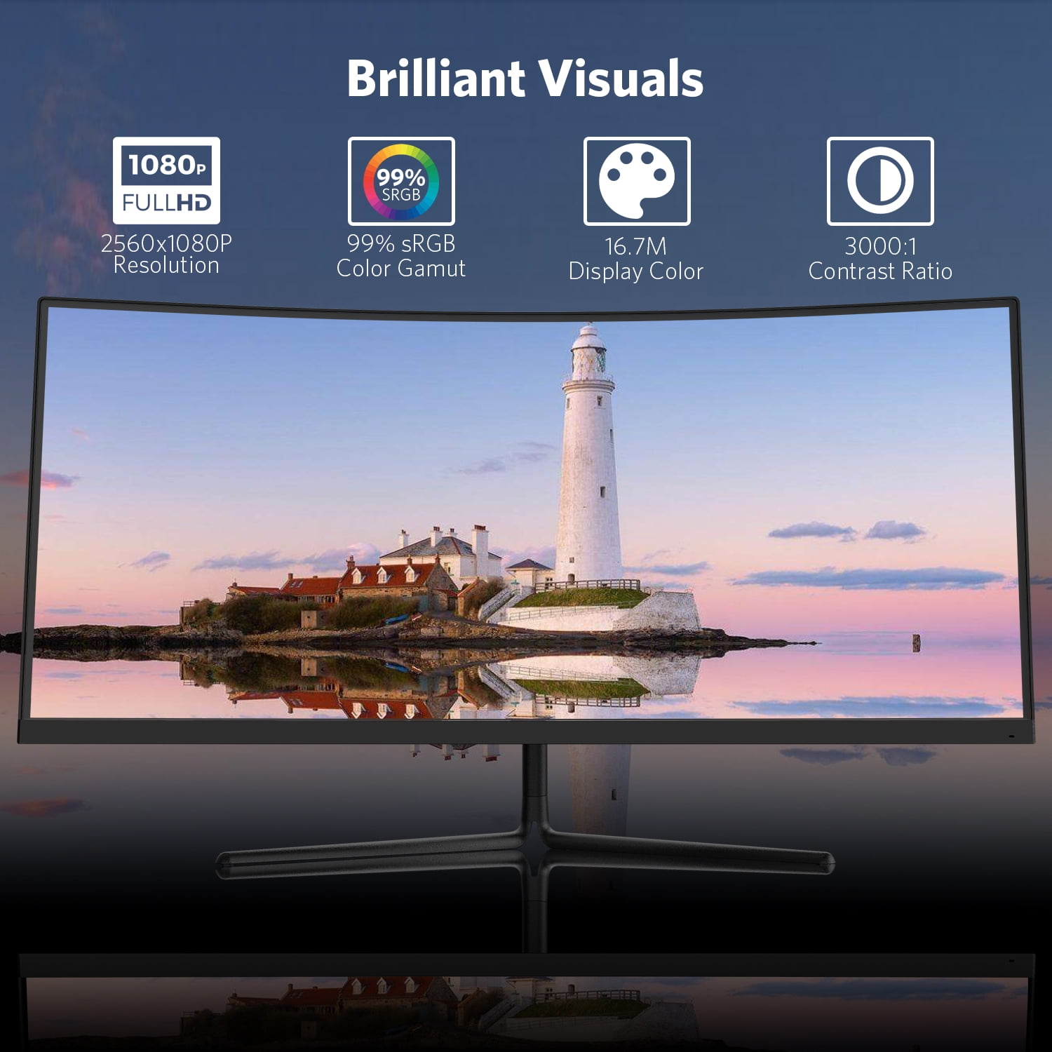 $137.59Fiodio 30” Ultra Wide 21:9 2560 * 1080P Curved Gaming Monitor, Adaptive Sync, 100Hz Refresh Rate, 2xHDMI and 1xDP. It’s an excellent ultrawide gaming monitor with a 30 inch 1080p VA screen, adaptive sync and a refresh rate 100Hz, results in clear motion with very little blur behind fast-moving objects. The large, high-resolution screen delivers great text clarity and sharp images. With 21:9 aspect ratio, the curved screen also delivers a more immersive gaming experience while also bringing the sides of the screen into your field of view.