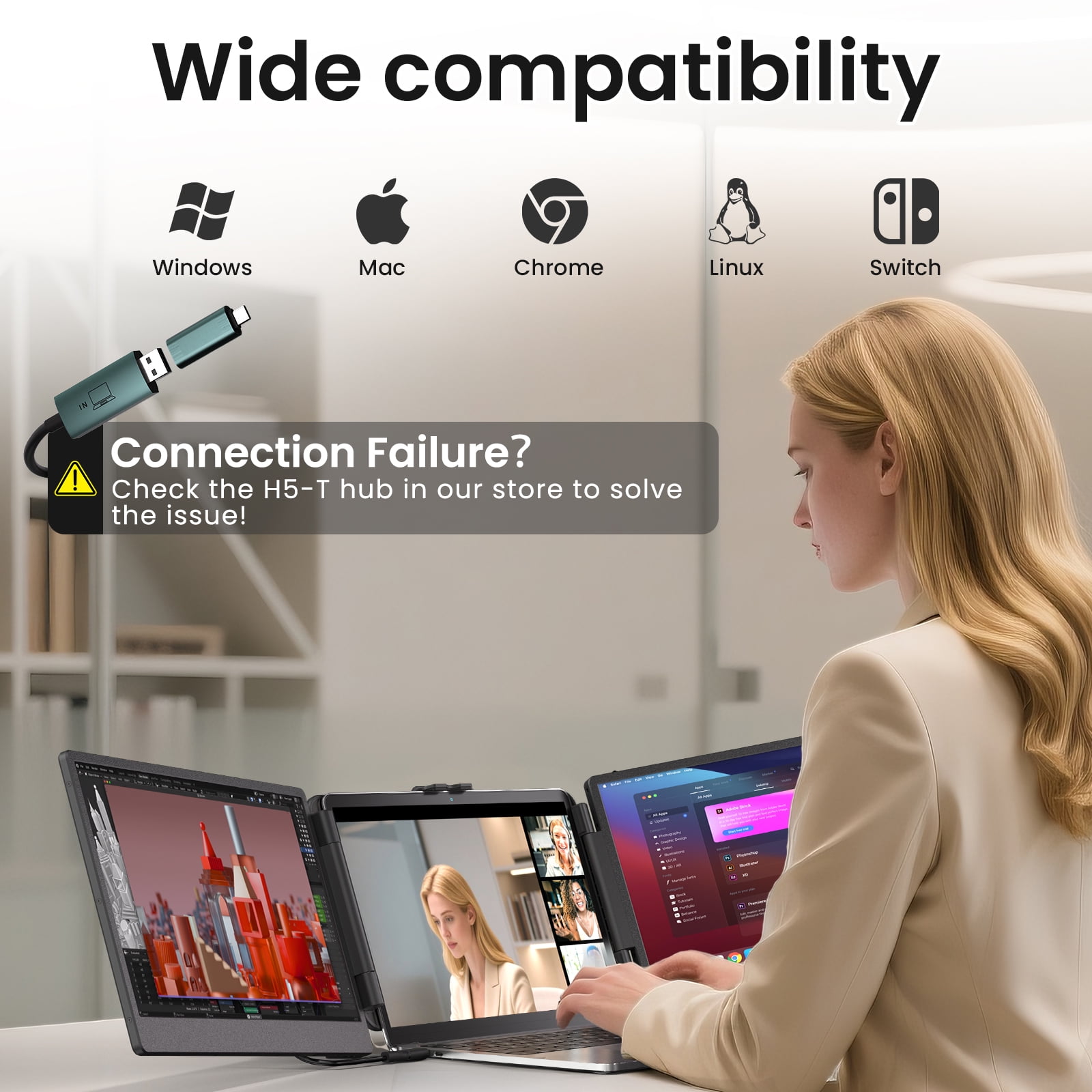 $85.99【Easy Setup & High Compatibility】 1 full featured Type-C port or 1 HDMI port(supports video outputs), that’s all you need to plug and play to start your daily work. This upgraded screen extender is designed to fit 13″-17.3″ laptops (MAXIMUM LENGTH: 15.74″). It is compatible with a wide range of operating systems, including Windows, MacOS,Linux, and Android. It can also be used with various devices such as laptops, tablets, PS5, Switch, etc. 【1080P Resolution & 14″ IPS FHD Screen】Immerse yourself in the vivid world of our S1 dual laptop monitors, equipped with 14-inch 1080P FHD IPS screens. Experience a clear and vibrant workspace with a brilliant brightness of 300 nits. This elevates your gaming experience, boosts work performance, and supercharges multitasking capabilities. 【Portable and Efficient】The dual portable laptop screen extender delivers powerful performance while remaining lightweight at just 2.11LB. It’s incredibly easy to connect to your laptop without the need for any extra accessories, allowing you to increase productivity by up to 100%. With a flexible stand, it ensures stable and steady screens. It conveniently fits into the included carrying bag, making it ideal for those who value both efficiency and mobility while traveling working, and gaming. 【Customizable Settings & Reverse Charge】Take control of your screen experience with our extender’s customizable settings. Adjust brightness, sound, contrast, and other parameters with a single button on the top. The extender supports a 180° screen rotation angle, allowing you to expand and mirror your screen setup as needed. Move your screens to find the perfect angle for your tasks. Additionally, the S1 double laptop extender can even reverse charge your phone and laptops when connected. 【Dedicated Customer Support】To ensure optimal performance with S1 monitor extender, please ensure: 1.Your laptop has at least 1 full featured Type-C port or 1 HDMI port(supports video outputs); 2.The maximum length of your laptop: 15.74 inches. Rest assured that all our products undergo rigorous pre-sale inspections to ensure quality. If you have any questions regarding compatibility, please don’t hesitate to contact us.