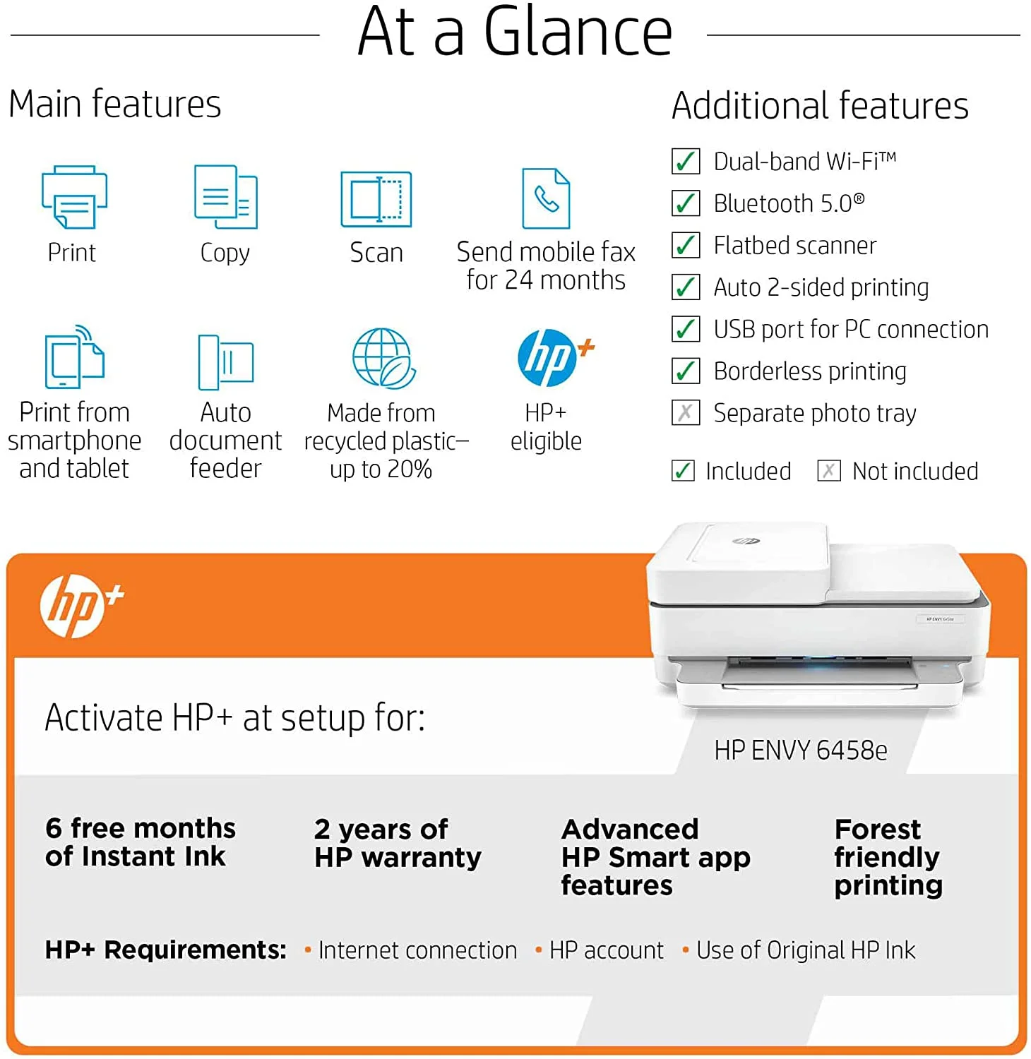 $113.61HP ENVY 64 58e All-in-One Printer w/ 6 months free ink through HP Plus Print Speed: Black: Up to 10 ppm Color: Up to 7 ppm Print Resolution: Black (best): Up to 1200X 1200 rendered dpi (when Printing from a computer) Color (best): Up to 4800 x 1200 optimized dpi color (when printing from a computer on selected HP photo papers and 1200 input dpi) Scan Resolution: Hardware: Up to 1200 x 1200 dpi Optical: Up to 1200 dpi Copy Resolution: Black (text & graphics): Up to 300 x 300 dpi Color (text & graphics): 300 x 300 dpi Standard Connectivity: 1 Hi-Speed USB 2.0 1 Wi-Fi 802.11ac (dual band) Mobile Printing Capability: HP Smart app Apple AirPrint Chrome OS Mopria-certified Duty cycle: Monthly (letter): Up to 1000 pages Paper Handling: Up to 100 sheets input tray 25-sheet output tray Borderless Printing: Yes (up to 8.5 x 11 in, 210 x 297 mm Assembled Size (W x D x H): 17.02 x 14.21 x 6.8