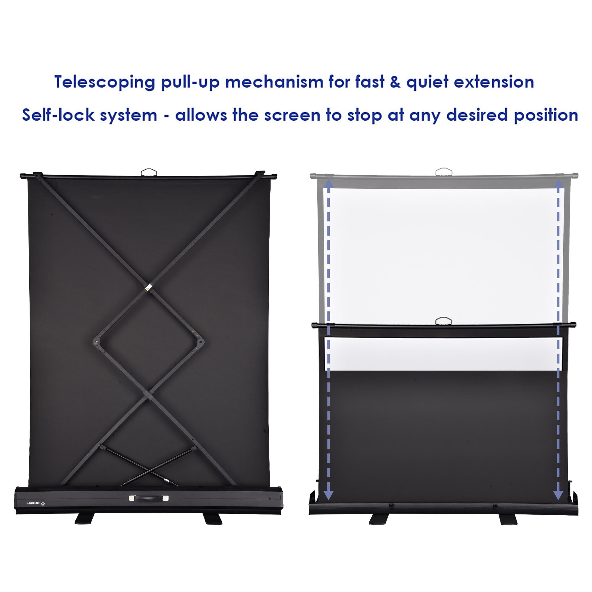 $146.11Portable Design – 60″ Pull Up Floor Projector Screen features a one-piece design and can be retracted fully into the case, ensuring easy storage, transport and perfect working synergy with handheld projectors for playing video presentations on-the-go. Pull-out to Use – Self-standing design with stable feet and telescoping pull-up mechanism that provides fast & quiet extension while the self-lock system allows the screen to stop at any desired position when you pull up to suit your preference. Good Light Diffuser – 60″ large matte white screen features 160 degree viewing angle for large viewing area and 1.3 gain to provide sharp and clear image, suitable for projections of all resolutions up to 4K or Ultra HD; Standard 4-side black borders help to increase picture focus & contrast for better viewing experience. Durable & Stable – Strong and rust-resistant aluminum frame and housing ensure frequent and long-lasting usage; Lockable feet to stabilize the screen when installed. Widely Applicable – Floor Projector Screen is ideal for indoor and outdoor use such as home theater, outdoor garden viewing, trade fair, meeting room and more to conveniently provide quality viewing wherever you are 0: Specifications: – Unfolded Overall Dimension(LxWxH): 52 3/4″ x 15 9/16″ x 82 5/16″ (134 x 39.5 x 209 cm) – Folded Overall Dimension (LxWxH): 52 3/4″ x 4 3/4″ x 5 1/8″ (134 x 12 x 13 cm) – Viewing Area Size (LxW): 48″ x 35 7/8″ (122 x 91 cm) – Diagonal: 60″ (152 cm) – Aspect Ratio: 4:3 – Viewing Angle: 160 degrees – Gain: 1.3 – Net Weight:19.95 Lbs (9.05 kg) Package Contents: – 1x Pull-Up Projector Screen – 1x Manual Notice: – Suitable for front projection