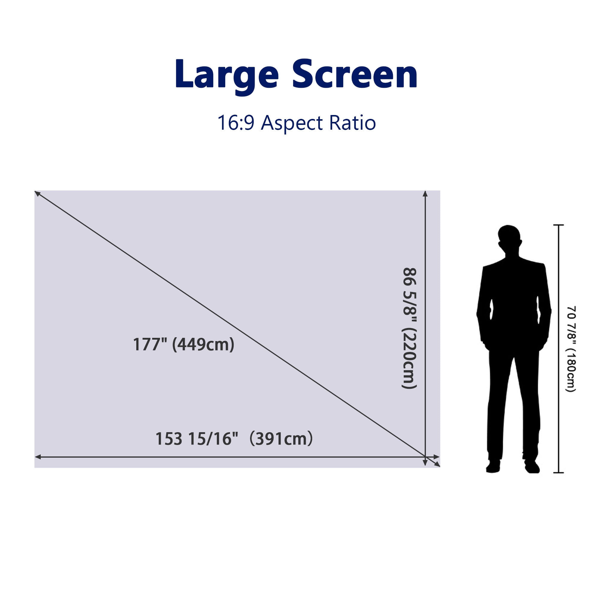 $111.71Features: – Large Screen – 16:9 front projection screen material features 177″ diagonal size for providing a large viewing area of 153 15/16″ x 86 5/8″ with 160 degrees wide viewing angle, ideal for projecting colorful images and videos clearly and enhancing your visual enjoyment – Matte White Screen – Made of high strength PVC coated textile, the screen material provides durability and flexibility, great for long time use; matte white surface for diffusing projected light uniformly and protecting eyes; standard black back for avoiding light penetration and improving light focusing – Cuttable & Customizable – One-piece customized screen material can be cut into desired size to fit your screen frame, suitable for DIY your projection screen to meet different projection requirements – Easy to Storage – Rollable design for easy storage, you can roll it up conveniently when you don’t use it; light weight for portability, perfect for carrying to different places and using whenever you need – Wide Application – Widely applied for home theater, office, school education, conference room, presentation, public display, parties, weddings, backyard movie cinema and more Specifications: – Screen Size: 153 15/16″ x 86 5/8″ (391 x 220 cm) – Diagonal: 176 3/4″ (449 cm) – Screen Material: High strength PVC coated textile – Aspect Ratio: 16:9 – Viewing Angle: More than 160 degrees – Gain: 1.1 – Net Weight: 8.8 Lbs (4 kg) Package Contents: – 1x DIY Projection Screen Material – 1x User Manual Notice: – This projector screen cannot be folded, please roll it up for storage if needed.