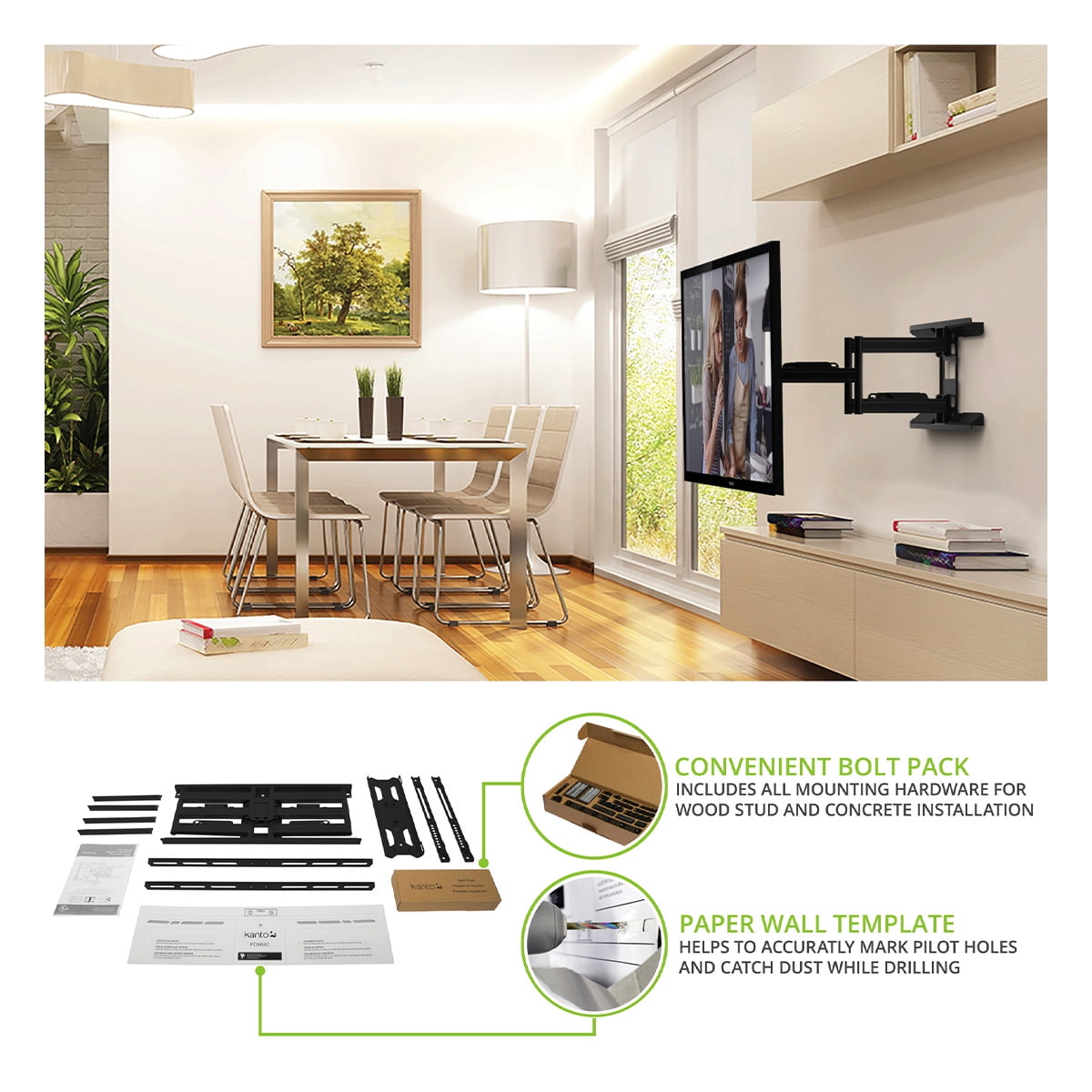 $154.79The PDX650 from Kanto is a full motion TV wall mount that allows your flat screen TV to sit 2 from the wall. Its generous tilt and swivel capabilities are complemented by 21.8 of extension making it easy to place your TV in the most optimal position. Magnetic wall plate covers are also included to hide any sign of installation. Exceptionally strong yet lightweight enough to make installation a breeze this TV wall mount will ensure your TV remains safe and secure.