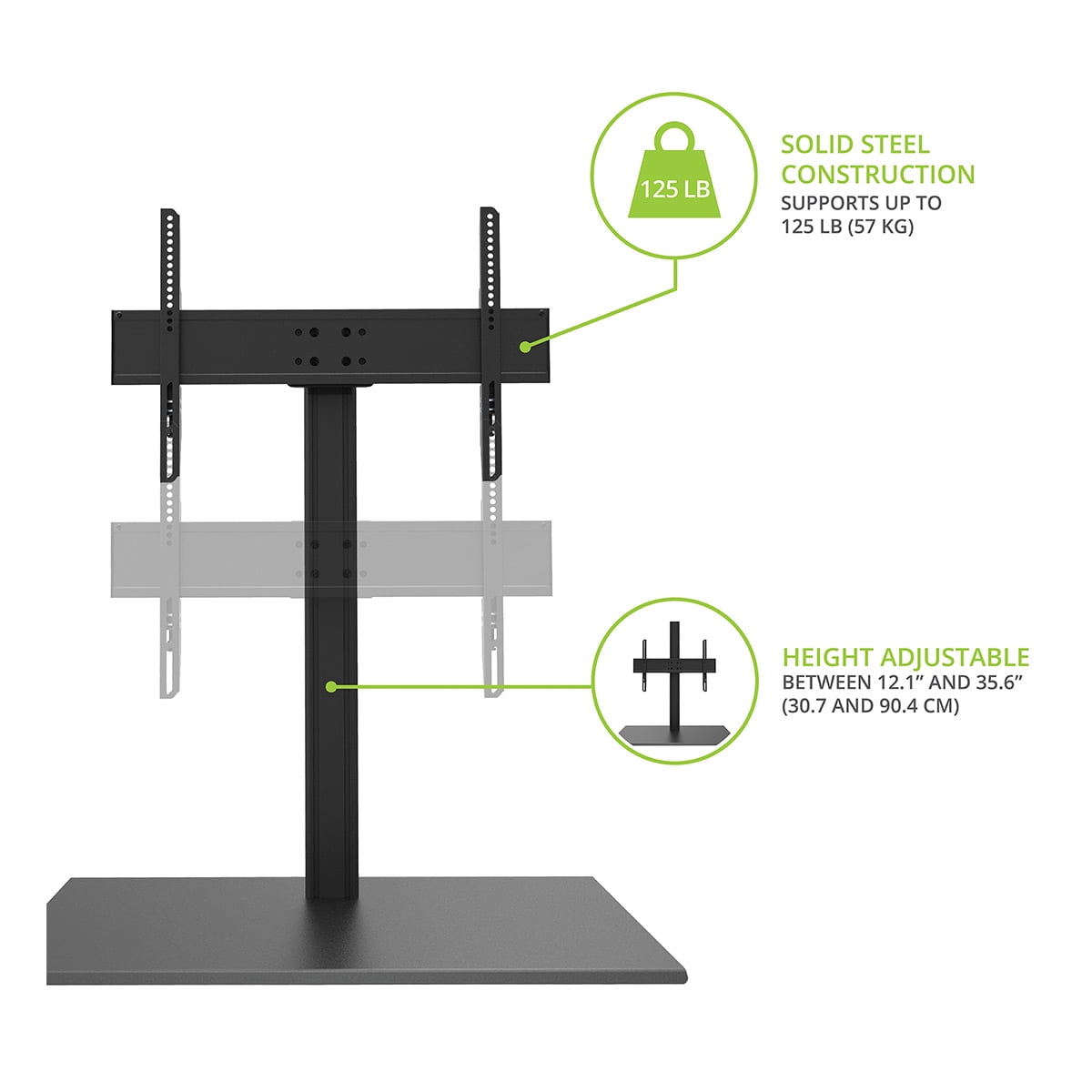 $214.99Enjoy your ultra-large home theatre experience with peace of mind with the premium TTS150 adjustable TV stand. Designed to sit on your furniture the tabletop TV mount is a step beyond stock TV stands. It supports the largest TVs currently available with a weight capacity of 125 lbs plus includes a safety tether for extra security. Its single column design features 12.7” to 35.6” of height adjustment along with 32° of swivel tilt and leveling. The TTS150 offers easy non-destructive installation and added functionality over the included TV legs.