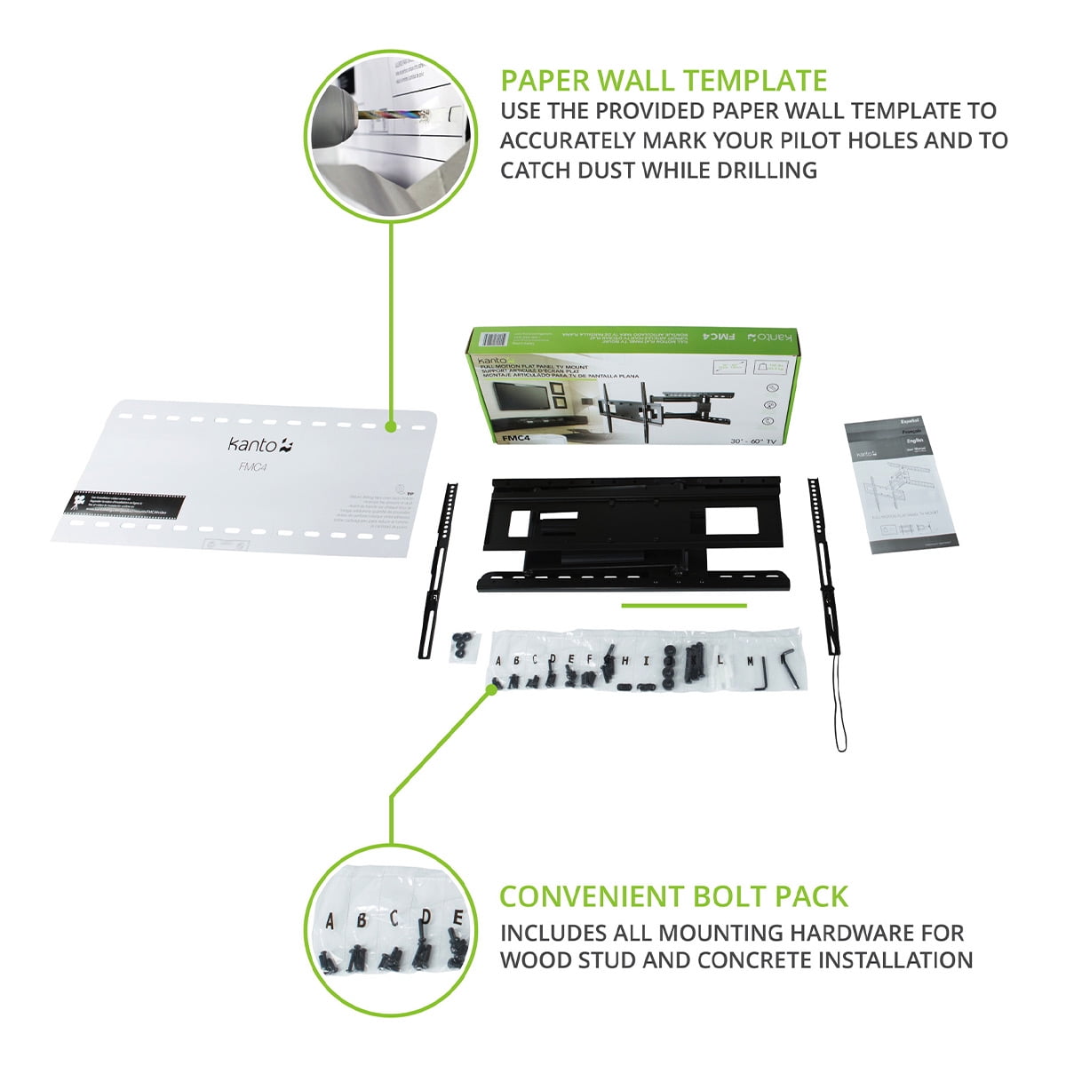 We supply you with everything except a toolbox to ensure that your installation goes smoothly. Instruction manuals are provided in English French and Spanish as well as the parts you need to mount your TV safely and securely. Easy-to-follow online videos and phone support are available to assist you along the way.