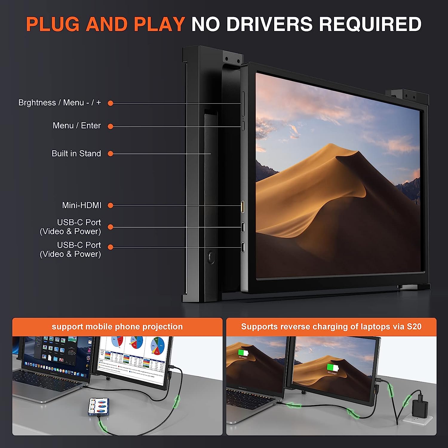 $773.14Original price was: $773.14.$343.99Current price is: $343.99.🌈【LIMINK 2023 Efficient Portable Workstation 】 The S20 laptop screen extender is the largest size portable triple monitor or laptop in the market, allow you including two 15.4″ frameless screens clip on your any laptops, increasing productivity by 300%. 🌈【Realistic visual experience】 Upgrade the traditional 12-inch 220nit laptop triple monitor to a 15.4-inch 1080p, 300nit narrow-bezel triple monitor. 🌈【Portable Efficiency Tool】 It allows you to fold the triple portable extended monitor into a book-like size, you can easily put it in your backpack and take it wherever you need it. 🌈【More Humanized Design】 Each screen of S20 is equipped with a menu key and a brightness adjustment key, which can possible setting brightness, HDR etc. After disconnecting, there is no need to reset the next time-memory function. Each screen has 1*HDMI and 2*full-function USB-C (supports trans power and video). 🌈【Special functions】 The S20 dual monitor USB-C port supports reverse charging of laptops using the power supply, also support mobile phone projection(phone supports computer mode).