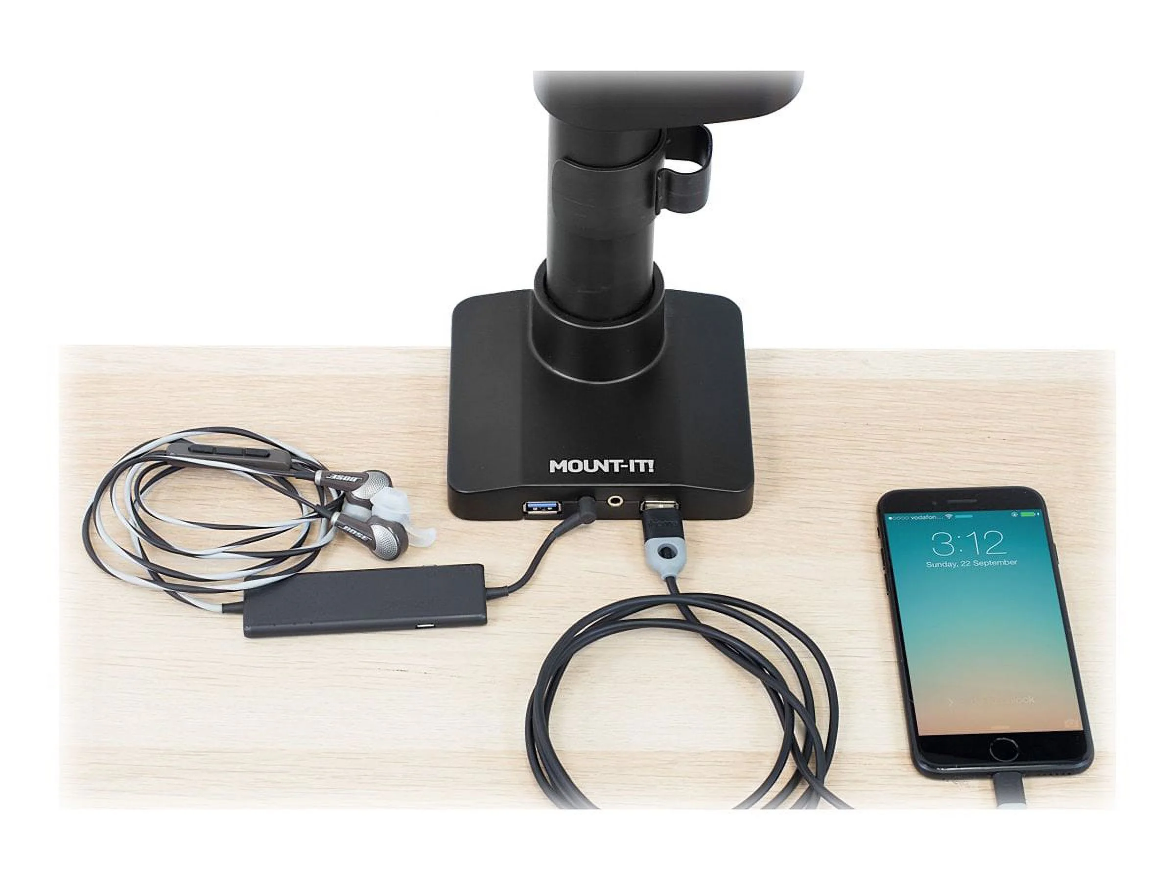 • USB and multimedia ports are built into the mount’s base to simplify connectivity – great for charging or data transfer.