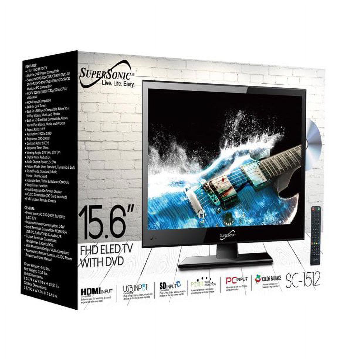 $94.5913.3 inches ELED FULL HD TV, Built-in dual tuners, HDMI input compatible, HDTV 1080p/1080i/720p/480p/480i, Built-in USB input compatible allows you to play music and photos on your TV, Aspect ratio: 16:9, Resolution: 1920 x 1080, Brightness: 200cd/m², Contrast ratio: 500:1, Response time: 27ms, Viewing angle: 170° (H), 170° (V), Digital noise reduction, Audio output power: 2 x 3 W, Color depth: 16.7 M, Picture mode: User, standard, Dynamic and soft, Sound mode: Standard, Music, Movie and User, Separate bass, treble and balance controls, sleep timer function, multi language on screen display, AC/DC compatible, full function remote control, adapter input: AC 100-240 V, 50/60 Hz, Power input: DC 12 V, maximum power consumption: 24 W, input terminals compatible: HDMI/ RF/PC RGB (VGA) and Audio L/R, output terminals compatible: Headphones, wall mountable design, VESA compliant, unit dimensions with stand: L 13.43 x W 4.72 x H 10.55 in. Unit dimensions without stand: L 13.43 x W 2.13 x H 9.17 in. Accessories: Remote control, AC power adaptor, and user manual.