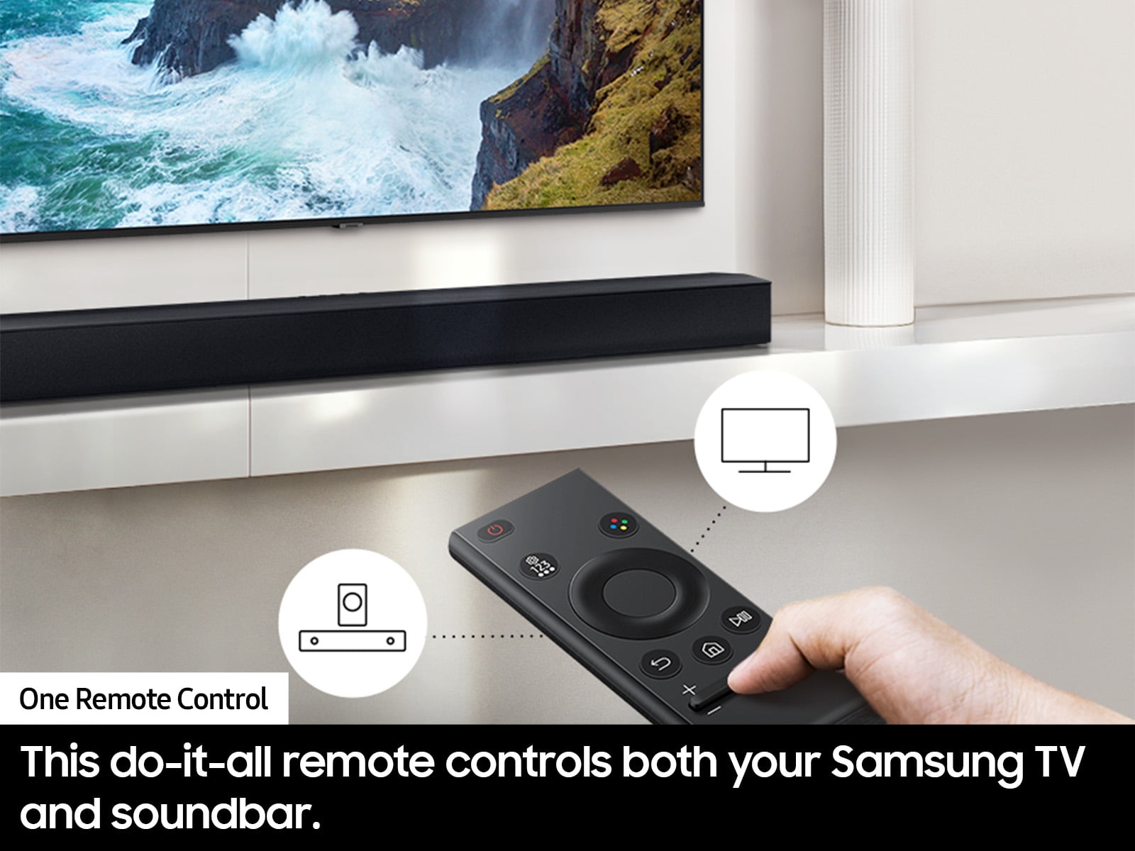 $101.47Designed for daily use. Add a soundbar. Enjoy everything more. From concerts to cooking competitions, for binging movies and streaming music, the SAMSUNG B-series 2.0ch Soundbar w/ Built-in Woofer HW-C400 is loaded with clever features that you’ll use every day. The built-in subwoofer brings depth without the clutter, and a do-it-all remote—along with Bluetooth(R) TV Connect —allow you to control your TV and soundbar all at once. *Requires a Bluetooth(R) compatible TV. Depth without the clutter. Go deep and hear more with this soundbar’s all-in-one, built-in subwoofer design. Mission control. Keep your finger on the pulse. This do-it-all remote controls both your Samsung TV and soundbar, helping you streamline your home entertainment setup. More the merrier. Invite your friends. This soundbar expands the optimal listening zone emanating sound all around you. Now everyone can hear like they claimed the best spot on the sofa. Clear as a bell. Voice Enhance optimizes the equalizer and amplifies the dialogue on the screen so that voices can be heard more clearly. Keep it on the down low. Enjoy stellar sound even when they’re sleeping. Switch on Night Mode to tamp down the volume and compress the bass. Skip the setup. Skip the extra steps and get right to the good stuff. Simply set your phone on the soundbar and let NFC (Near-Field Communication) pair the two automatically.