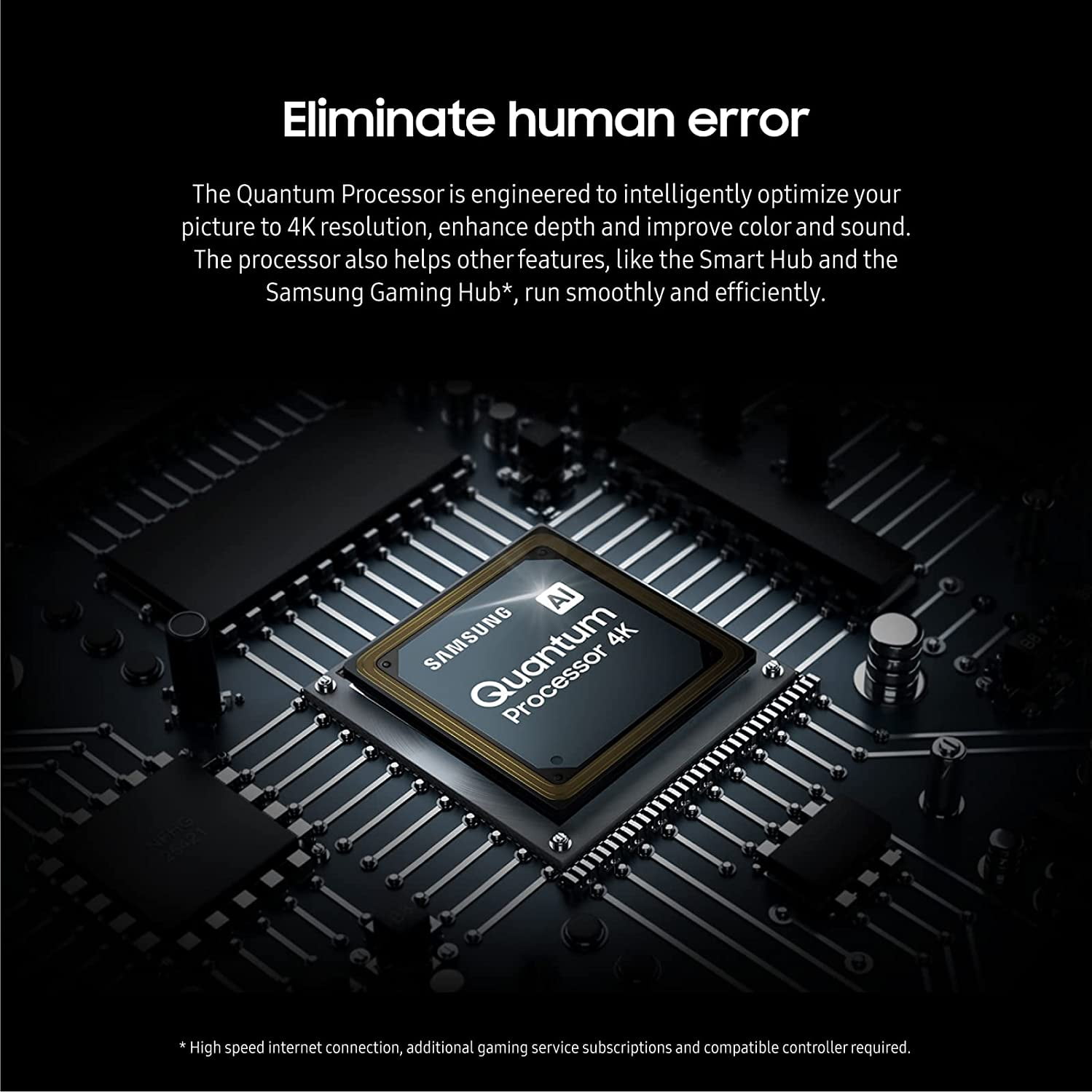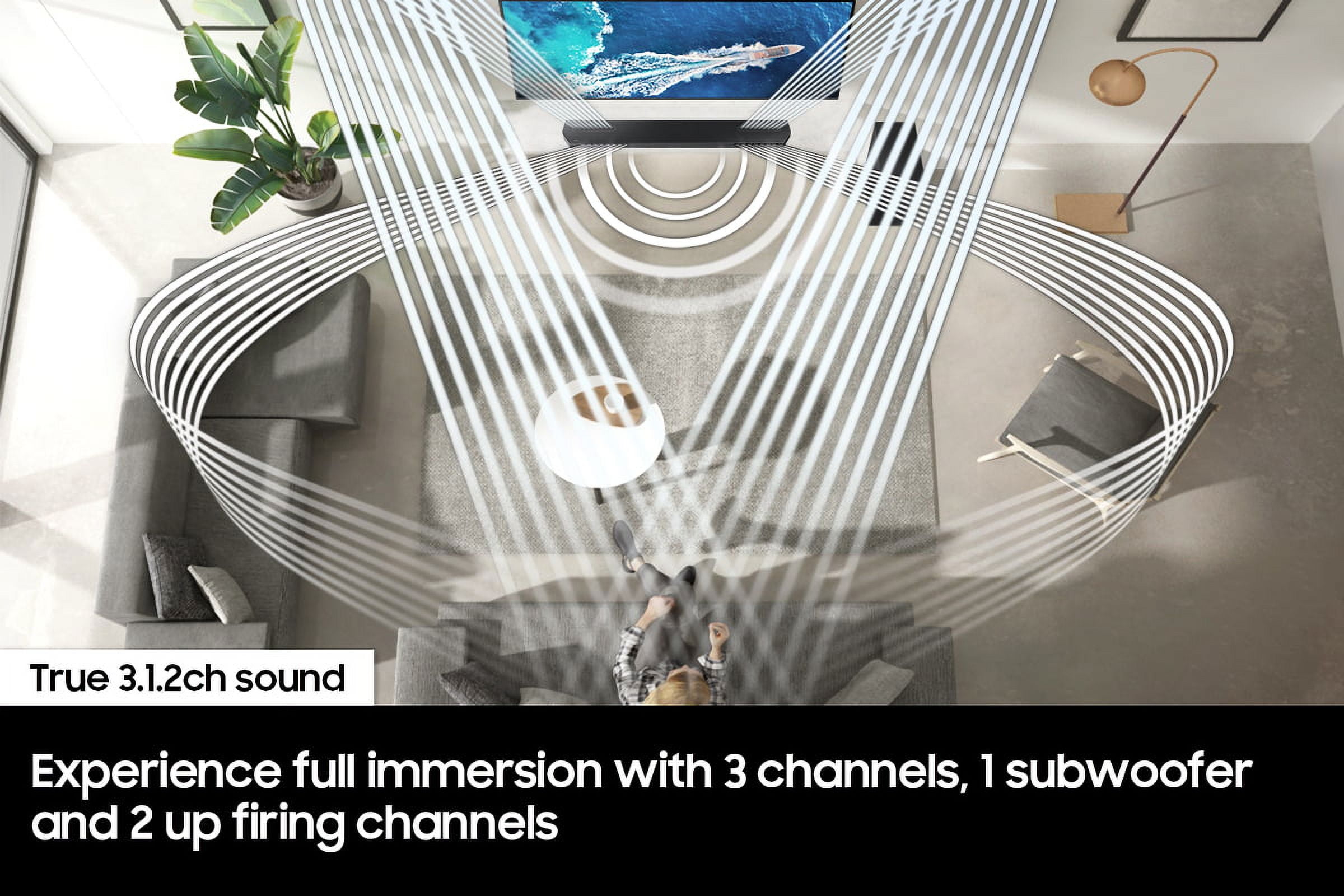 $386.99Perfectly crafted sound harmonized with QLED Features: Object-based formats like Dolby ATMOS and DTS:X technologies provide elevated 3D true surround sound in every direction Control your soundbar and other compatible devices using built-in voice assistant Complete your immersive home cinema setup with captivating sound from 3 channels 1 subwoofer and 2 up-firing channels that project audio overhead Automatically calibrated sound and enhanced clarity to adapt to your space Elevated sound from every direction Explore realistic 3D audio with sound precisely projected from above in front behind and to the side of you with the latest acoustic technologies. Immersing you in captivating sound The complete audio entertainment experience with 3 channels 1 subwoofer and 2 up-firing channels. Q Soundbar & Samsung TV in perfect harmony