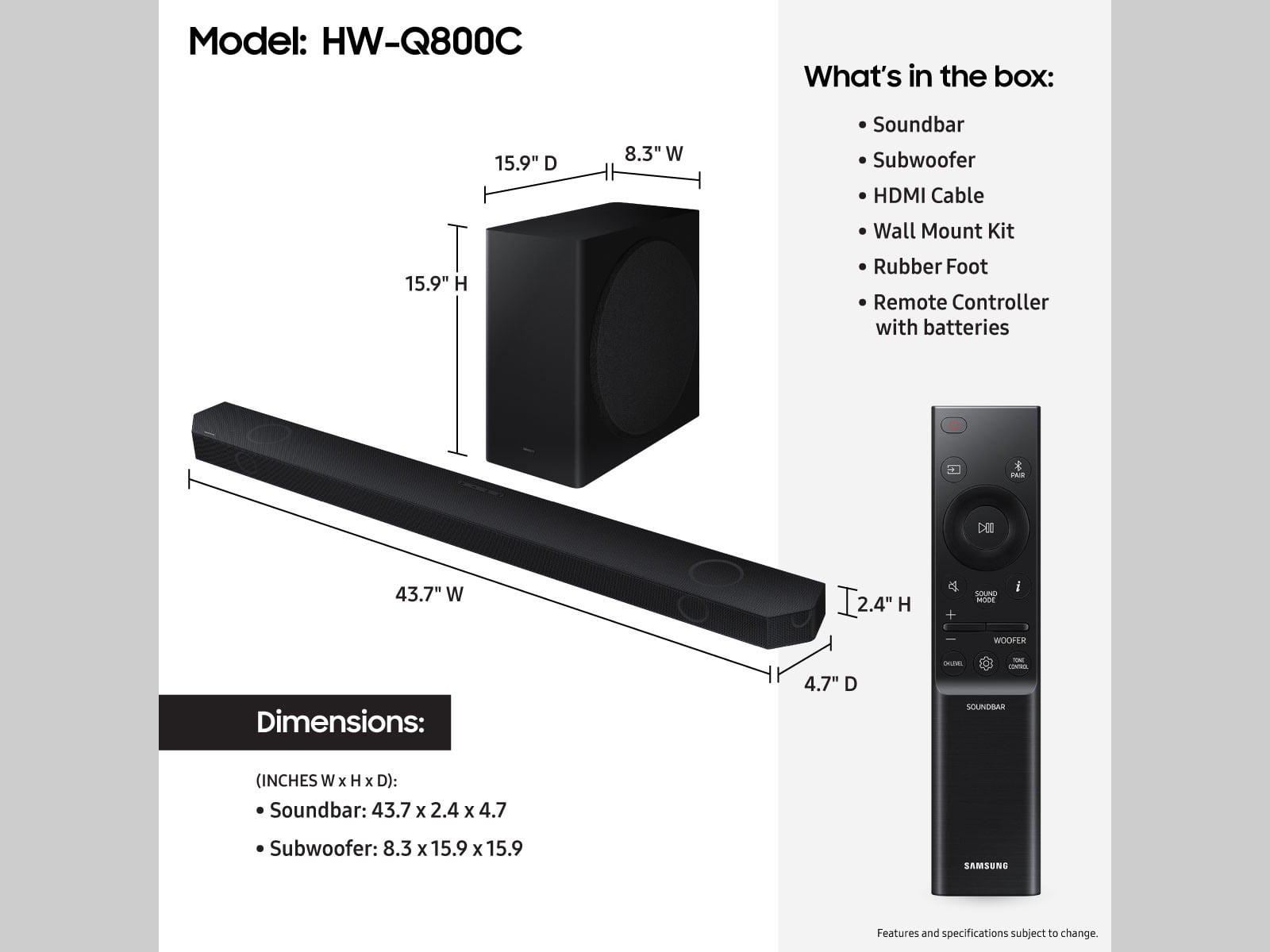 $859.99Original price was: $859.99.$601.14Current price is: $601.14.SAMSUNG Q-Series 5.1.2ch Wireless Dolby Atmos Soundbar w/ Q-Symphony HW-Q800D/ZA 2024 If you want your content to really come alive, this Samsung soundbar is the missing link. The Q800C produces life-like audio through 5.1.2 Ch. True Dolby Atmos sound, while harmonizing with your Samsung TV to maximize the potential of both.