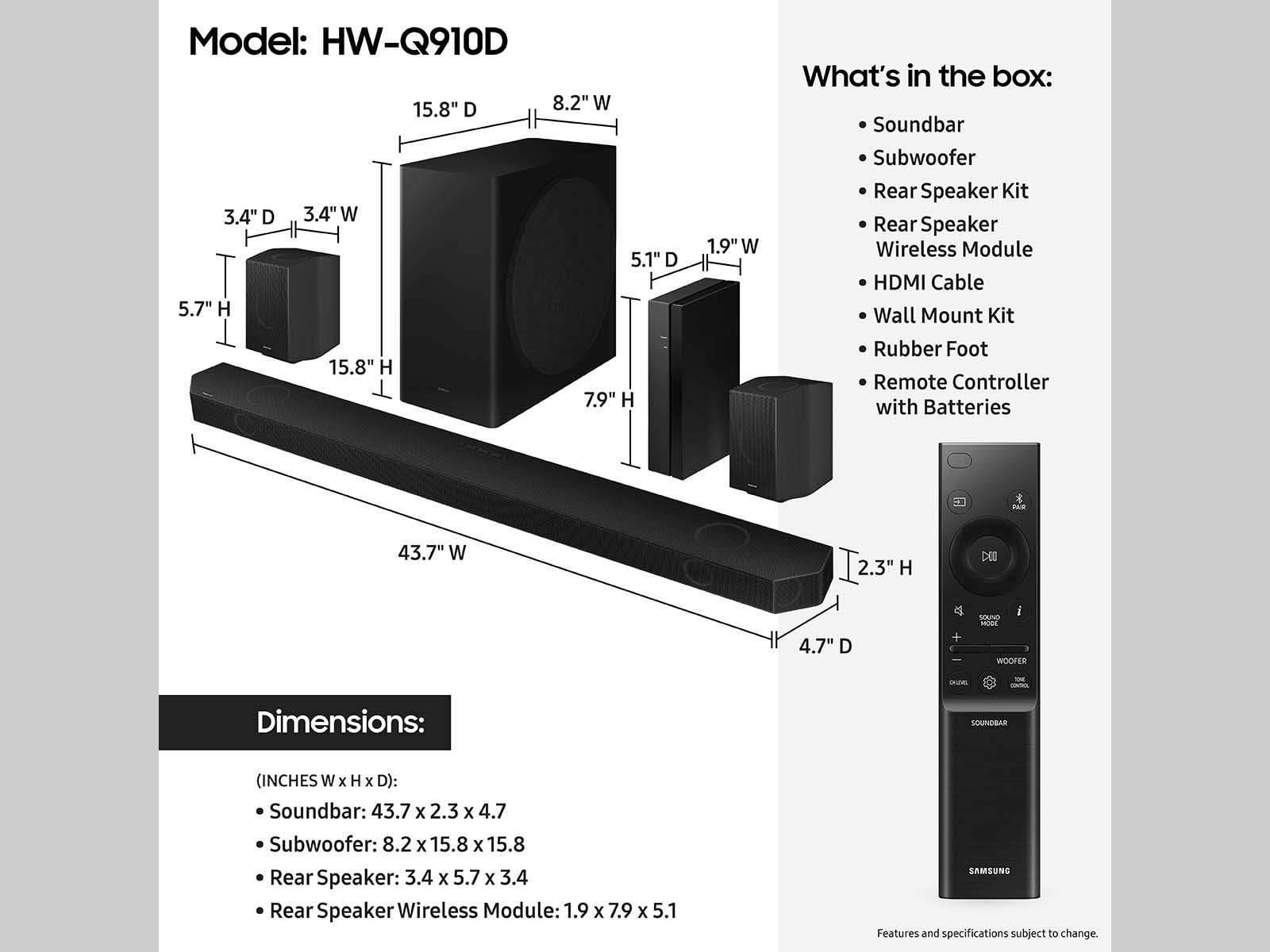 $601.99Experience striking Dolby AtmosTM audio from the Samsung Q-Series 9.1.2ch Wireless Dolby ATMOS Soundbar + Rear Speakers w/ Q-Symphony HW-Q910D/ZA, a smart Soundbar that stays in sync with your TV’s speakers* and surrounds you in sound from all angles. *Q-Symphony requires a compatible 2020-2024 Samsung TV. Please refer to samsung.com for more information.