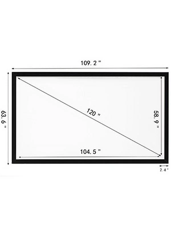 $154.79Product Description 120″ 16:9 Projector Screen The premium 120″ HD projector screen adopts NM optical PVC screen, provides you with more explicit images. Better than fabric ones on the market, it is wrinkle-, with no texture, and water washable. Compatible with daily 3D movies, 4K, HDTV, PPT, pictures, and games. With actual 160° viewing angles, when paired with the HD projector, you can enjoy cinema-quality entertainment at home. Specifications Screen Resolution: 4K HD Compatible Aspect Ratio: 16:9 View Angle: 160° (Actual) Gain: 1.2 Diagonal Size: 120 in/304.8 cm Screen Material: PVC Frame Material: Aluminum Alloy Frame Surface Material: Black Velvet Screen Size: 104.5″ X 58.9″/265 X 149.6 cm Frame Size: 109.2″ X 63.6″/277 X 161.5 cm Item Weight: 18kg / 39.6lbs Package Content 1 x Projector Screen(with Accessories) 1 x Install Instruction
