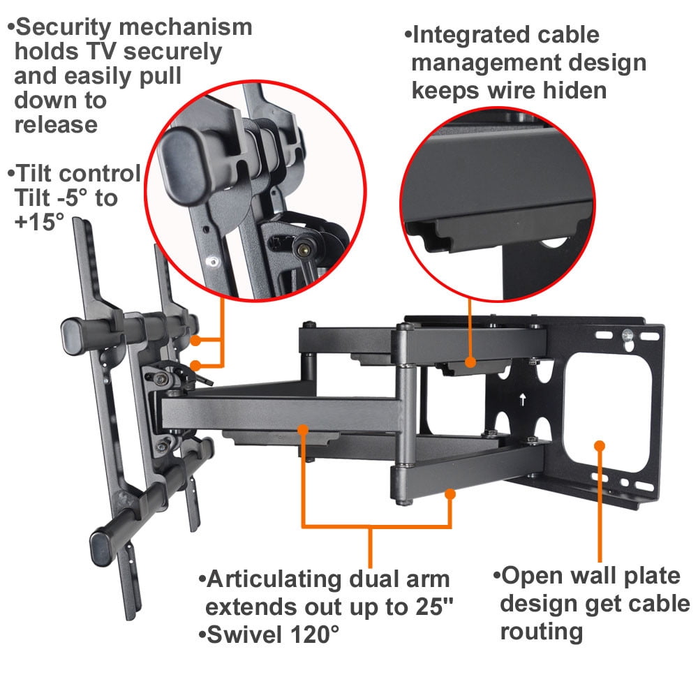 $95.37The articulating heavy duty TV wall mount fits most 40-80″ LED LCD Plasma flat panel screen, some LED up to 88″ with VESA mounting hole patterns up to 684x400mm. This TV mount is constructed with thick high grade steel providing security and stability. Adjustable tilt, swivel, rotate and extension place your TV in multiple viewing angles.