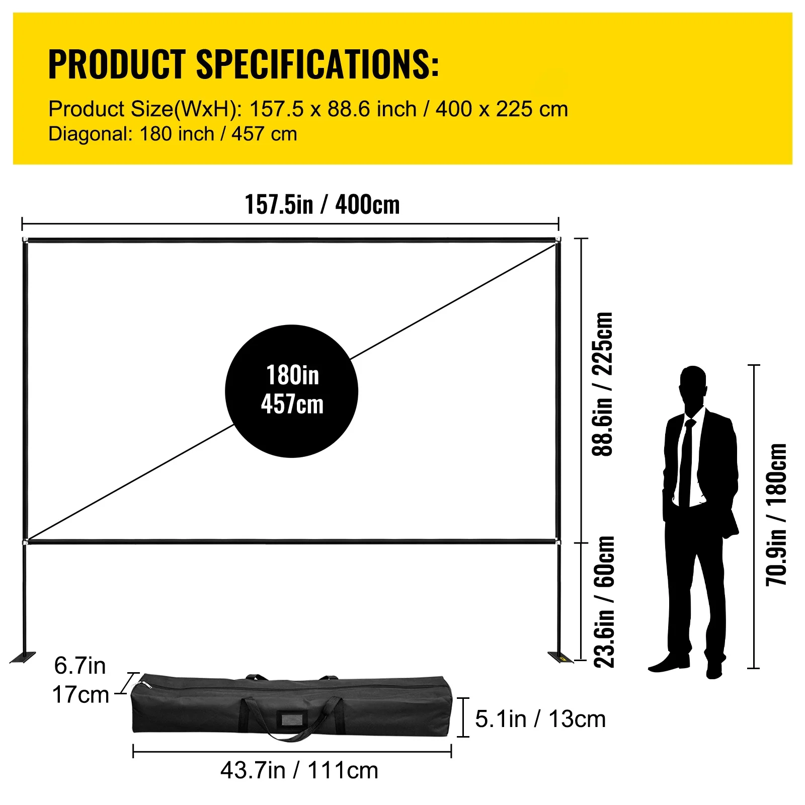 $124.58Product Description 180″ Outdoor Movie Screen w/ Stand The movie screen for outdoor use features 16:9 high definition and a 160-degree wide viewing angle. The upgraded high-textile oxford cloth can get better photosynthesis and more clearer projection. It’s easy to install and portable anywhere. You can enjoy movable cinema at home, outdoor, hotel, ceremony, etc. Specifications Screen Material: High-textile Oxford Cloth Stand Material: 6061 Aluminum + 45# Steel Diagonal: 180″ / 457.2 cm Aspect Ratio: 16:9 Viewing Angle: 160 Degree Screen Size:157.48 x 88.58″ / 400 x 225 cm Unfolded Height: 71″ / 180.34 cm Storage Pouch Length:30.3″ / 76.96 cm Package Content 1 x Projector Screen 1 x Storage Pouch 2 x Base 8 x Aluminum Alloy Tubes 8 x Ground nails 4 x Ropes 1 x Needle & Thread Set 1 x Manual