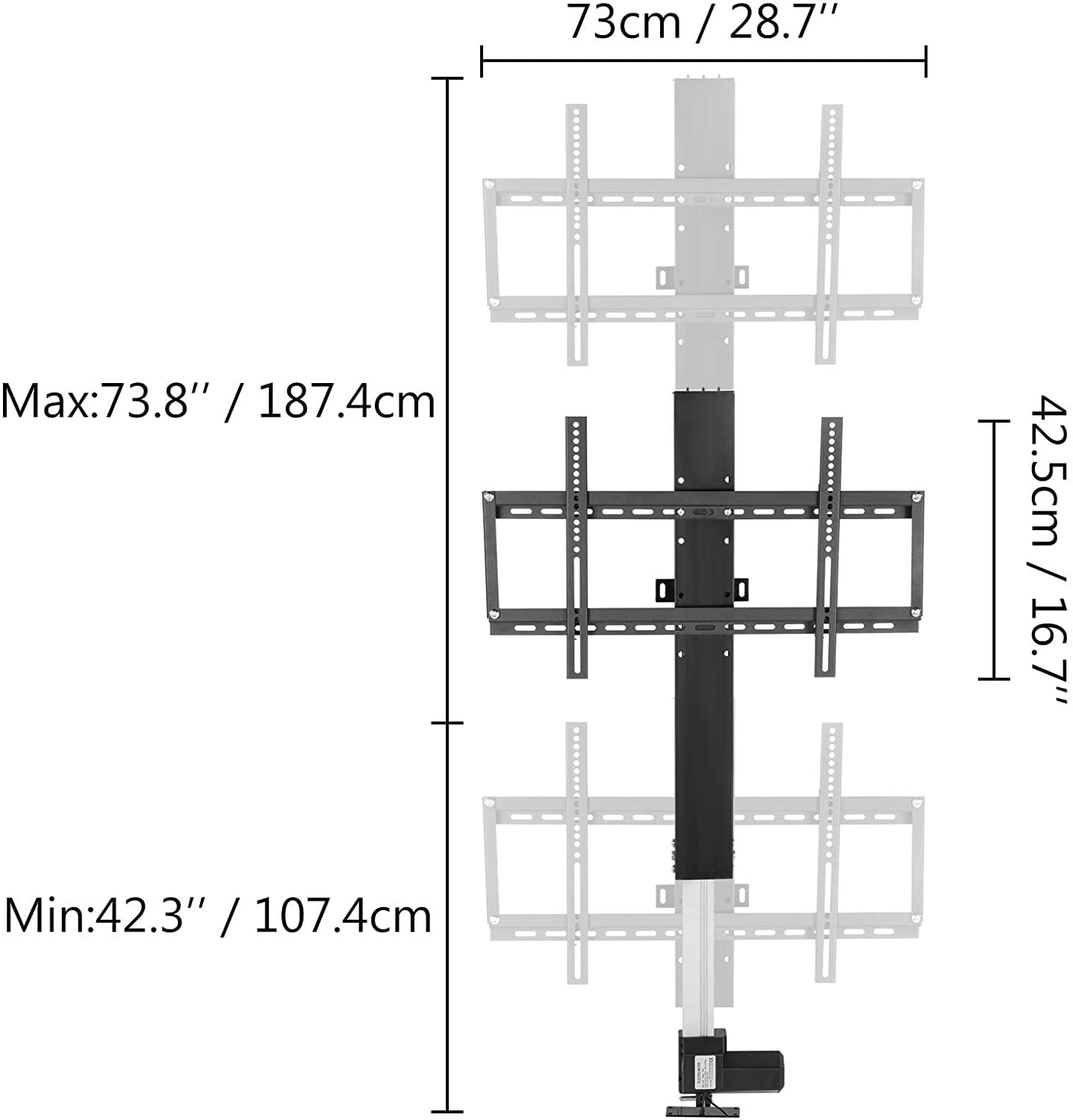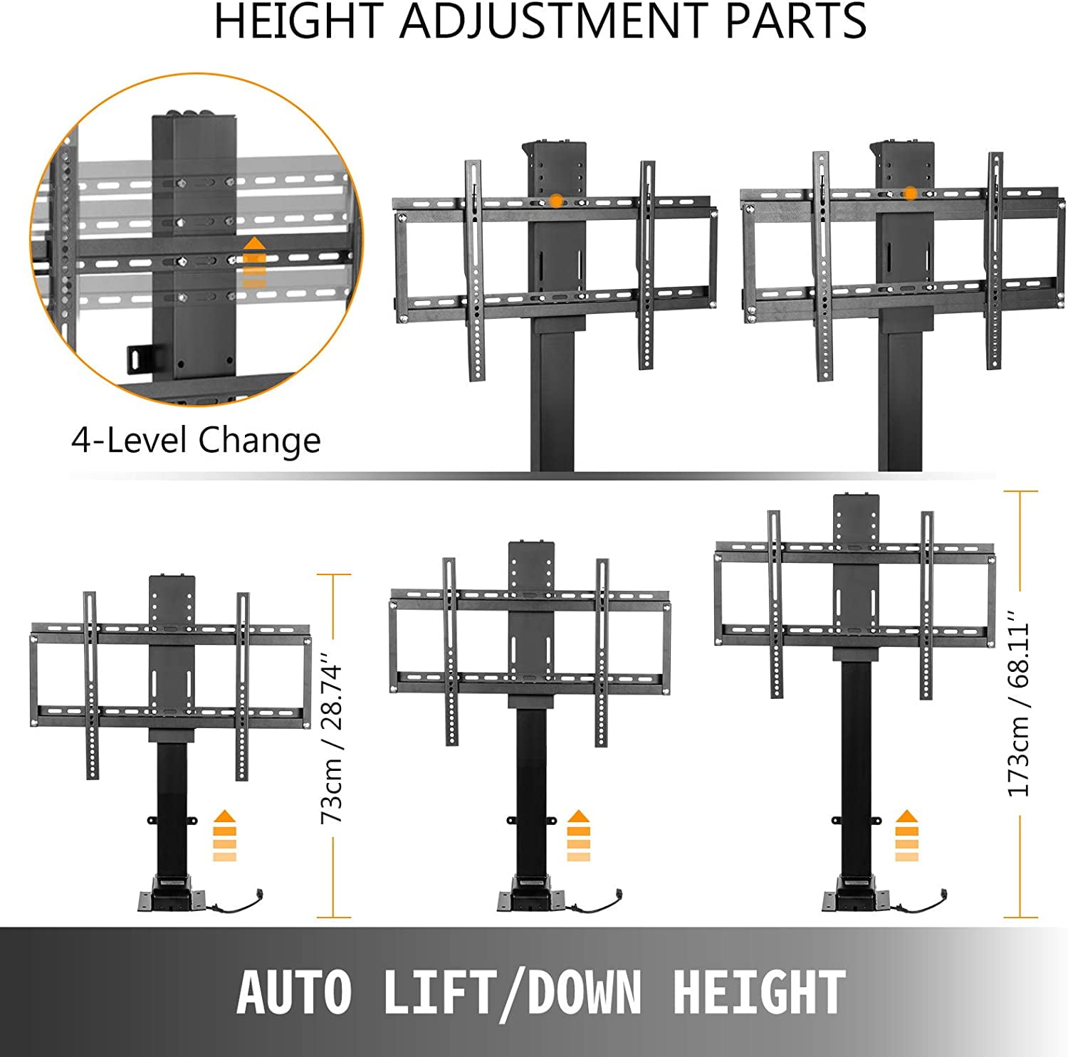 Motorized TV Lift BracketAre you searching for a way to lift/down your TV? Look no further! Our upgraded electric TV lift stand is the choice. Freely to control the lift or down of your 32-70″ TV at any height from 28.74″-68.11″ with 2 ways: wireless long-distance regulator or wire-connected hand controller. Mounted on the wall, compatible with various TV types. It is truly a must-have for people who have a high taste of life. Get it Now!Carbon Steel FrameThis lifting mechanism for TV is constructed with high-strength carbon steel plates and powder-coated on the surface, which is sturdy, anti-rust, and durable to hold your TVs.Auto Lift/Down HeightAutomatically lift or down the TV ranges from 73 cm to 173 cm(28.74″-68.11″) with controller pad. Thus, you can stop the TV at any height you want and get the watching experience.Powerful Electric MotorTV height adjustment is dominated by the motor. To upgrade the movement, we equip this bracket with a 24V 1000 N electric motor to run strongly.Compatible Most TVsThis electric TV lift is compatible with most 32″-70″TVs, such as LCD, LED, plasma, curved TVs from brands: Samsung, Sony, LG, Sharp, Insignia, Vizio, Haier, etc.Dual Controller IncludedTo offer you a more convenient service, we will offer a long-distance regulator and a wire-connected controller. It can memorize four preset height data and show real-time height on the screen.Wide Application PlacesThis product can be mounted on the wall or ground for stability and fixation. It is suitable for both home & commercial occasions, like bedroom, meeting room.Specifications