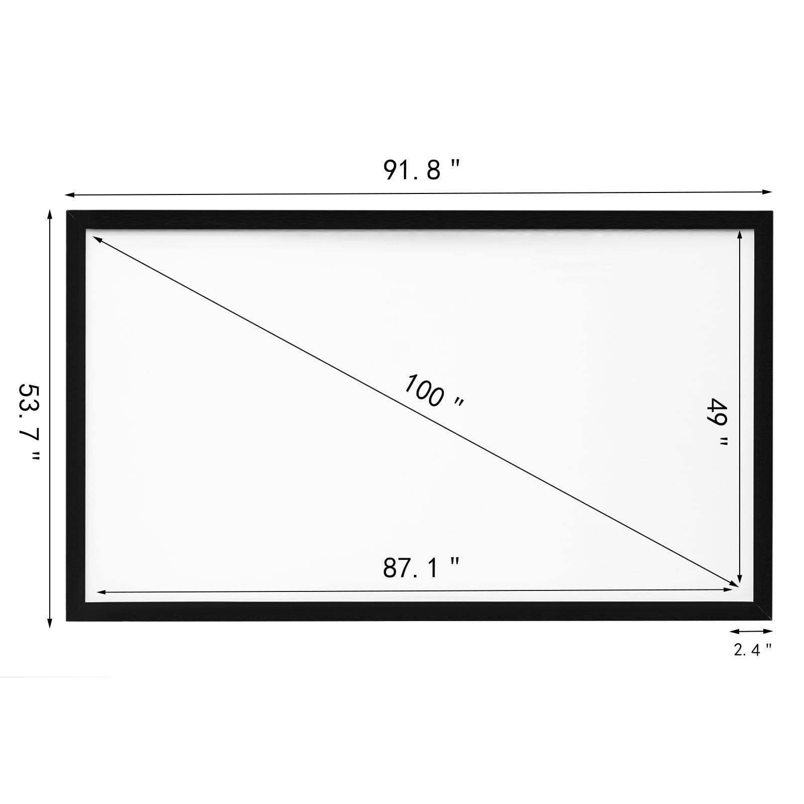 $145.34Brand Introduction VEVORbrand is a leading brand that specializes in equipment and tools. Along with thousands of motivated employees,VEVORbrand is dedicated to providing our customers with tough equipment & tools at incredibly low prices. Today, VEVORbrand has occupied markets of more than 200 countries with 10 million plus global members. Why Choose VEVORbrand? 1.Tough Quality Assurance 2.Incredibly Low Prices 3.Fast & Secure Delivery 4.30-Day Free Returns 5.24/7 Professional Customer Service Product Description 100″ 16:9 Projector Screen The premium 100-inch projector screen adopts NM optical PVC screen, provides you with more explicit images. Better than fabric ones, our video screen is wrinkle-, with no texture, and water washable. It is compatible with daily 3D movies, 4K, HDTV, PPT, pictures, and games. With a 160-degree viewing angle, when paired with the HD projector, you can enjoy cinema-quality entertainment at home. Aluminum Alloy Frame The movie screen’s frame is made of high-strength aluminum alloy, wrapped in black velvet, making it light-absorbing and beautiful. High-Definition Screen With high-quality PVC material, the screen for projector features low reflectivity and presents brighter, softer, and clearer images for the audience. 160-Degree Viewing Angle The outdoor screen provides an extensive viewing angle of 160 degrees, allowing users to choose comfortable viewing positions freely. Wall-Mounted Design The wall-mounted design makes this movie projector screen easy to install. Two hanging parts on the top frame are used for wall-hanging. Easy to Clean This portable movie screen can be easily wiped clean with a cloth or washed with water. It is wrinkle- but cannot be machine washed. Wide Application Ideal for home, classroom, office, wedding, bar, party, etc., this portable screen for projector is widely used for film and video screening. Specifications Screen Resolution: 4K HD Compatible Aspect Ratio: 16:9 View Angle: 160° (Actual) Gain: 1.2 Diagonal Size: 100″/254 cm Screen Material: PVC Frame Material: Aluminum Alloy Frame Surface Material: Black Velvet Screen Size: 87.1″ x 49″/221 x 124 cm Frame Size: 91.8″ x 53.7″/233 x 136 cm Item Weight:12.4kg/27.34lbs Package Content 1 x Projector Screen (with Accessories) 1 x Install Instruction