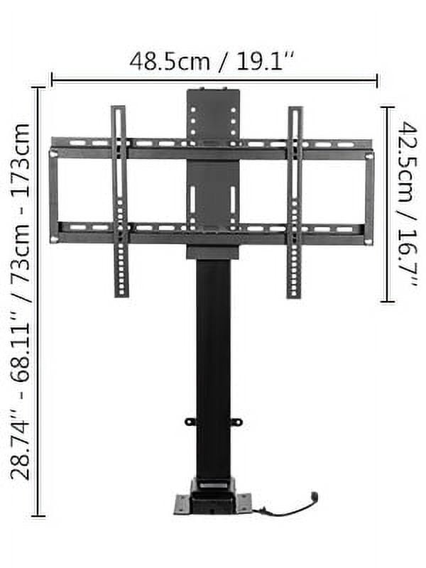 $152.21Brand Introduction VEVOR is a leading brand that specializes in equipment and tools. Along with thousands of motivated employees, VEVOR is dedicated to providing our customers with tough equipment & tools at incredibly low prices. Today, VEVOR has occupied markets of more than 200 countries with 10 million plus global members. Why Choose VEVOR? 1.Tough Quality Assurance 2.Incredibly Low Prices 3.Fast & Secure Delivery 4.30-Day Free Returns 5.24/7 Professional Customer Service Product DescriptionMotorized TV Lift Bracket Are you searching for a new way to lift/down your TV? Our upgraded electric TV lift stand flexibly control the lift or down in 2 ways: wireless remote control or wire-connected hand controller. It was mounted on the wall or ground, compatible with various TV types. 42.3″”-73.8” Flexible Height Automatically lift or down the TV ranges from 42.3″”-73.8”. Thus, you can stop the TV at any height you want and get the best watching experience. Powerful Motor The motor dominates TV height adjustment. We design this motorized TV lift with a 1000N electric motor to run strongly to upgrade the movement. Wide Compatibility This motorized TV lift mechanism is compatible with most 60″” TVs, such as LCD, LED, plasma, curved TVs from brands: Samsung, Sony, LG, Sharp, Insignia, Vizio, Haier, etc. Coated Aluminum Material This TV lift mechanism is constructed with thick aluminum alloy plates and powder-coated on the surface, high-strength, anti-rust, and durable to hold your TVs. Remote & Wire Control The package also includes a TV lift, a remote controller, a hand controller, a power adapter, and a receiver to provide you a more convenient control. Versatile Uses This motorized TV mount lift can be mounted on the wall or ground for stability. It is suitable for both home & commercial occasions, like bedroom, meeting room. Specifications Material: Aluminum Alloy Compatible TV Size: Max. 60″”/152 cm Height Adjustable Range: 42.3″”-73.8″” / 107.4-187.4 cm Lifting Speed: 3/5”/15 mm/s Length: 28.7”/73 cm Stroke Length: 31.5″” / 800 mm Load Capacity: 132 lbs Color: Black Package Content 1 x Motorized TV Lift 1 x Remote Controller 1 x Hand Controller 1 x Receiver Kit 1 x Screw Kit 1 x User Manual