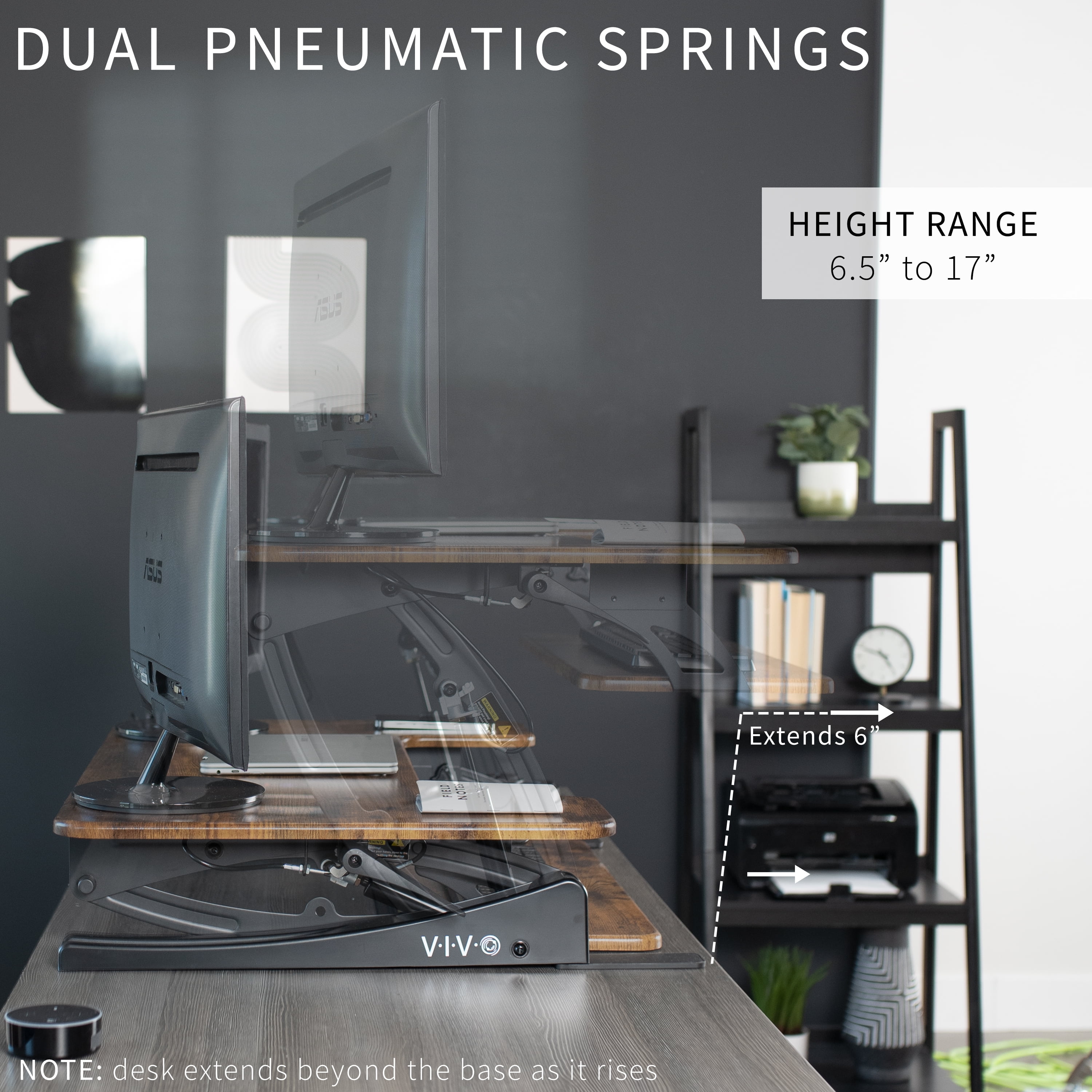 $189.19Enhance your work experience with Vintage Brown / Black 36” Desk Riser (DESK-V000VN) from VIVO! This dual-tiered platform sits on top of your current desk and gives you the benefit of standing or sitting on demand. The keyboard tray is removable for user preference. Transitioning between sitting and standing throughout the long work day provides numerous health benefits for the body such as increased blood flow and reduced aches and pains. Standing throughout the day also helps the mind stay alert and productive. Counterbalance tension adjusts to the weight of your desk and everything on it for easy upwards movement. Find your perfect height level with unlimited adjustment points between 6.5” and 17” from the desk surface. Specifications Color: Vintage Brown Top / Black Frame Type: Manual (Pneumatic Assist) Desktop Dimensions: 36” x 22” Keyboard Tray Dimensions: 25” x 10.5” Base Dimensions: 31” x 26” Height Adjustment Range: 6.5” to 17” Desktop Weight Capacity: 33 lbs Keyboard Tray Weight Capacity: 4 lbs Device Slot Length: 10”