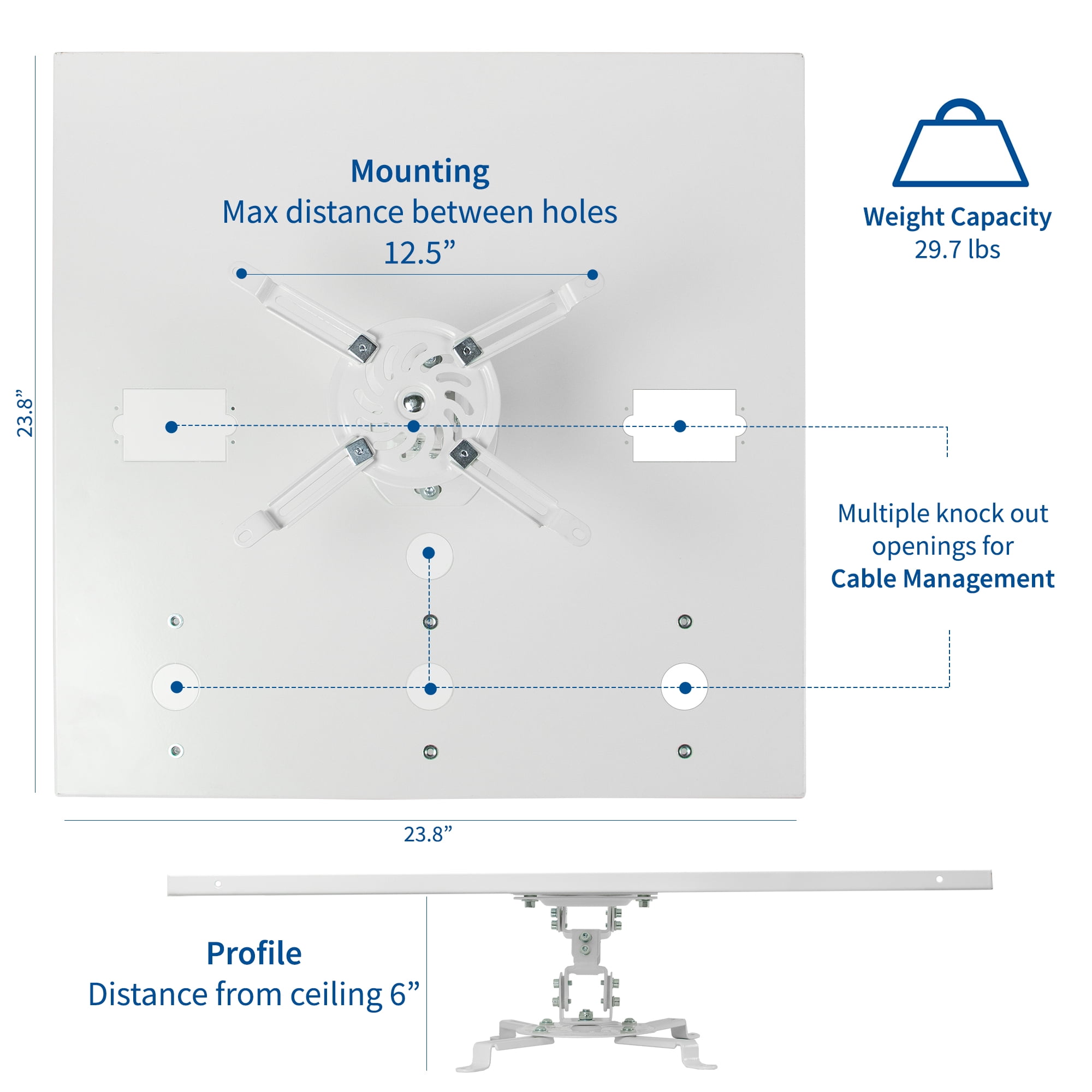 $85.99Avoid the hassle of conventional projector mounting with Drop Ceiling Projector Mount (MOUNT-VP07DP) from VIVO! Instead of having to buy mounting fixtures and put holes in your ceiling, take advantage of this mount that can replace any 2’ x 2’ ceiling tile and blend in with virtually any environment. With your projector at an ergonomic height, your audience can enjoy a comfortable viewing experience without straining their back, neck, or eyes. This mount features -15° to +15° tilt, -15° to +15° swivel, and 360° rotation for comfortable viewing angles, solid steel construction for a safe and secure setup, integrated cable management for an organized appearance, adjustable mount extension joints for perfect alignment, and more! All the necessary hardware and instructions are provided to get your mount assembled and projector installed in no time! Compatibility Designed to fit the majority of projector brands on the market with mounting holes up to 12.5″ apart. Before purchasing, be sure to measure the distance between your projector’s mounting holes (especially the diagonals). If all diagonals measure 12.5″ or less, this mount will fit your projector. Specifications Color: White Material: Steel Mounting Holes: Up to 12.5″ Arm Brackets: 5.0″ x 1.0″ x 0.7″ Mount Base Dimensions: 5.2″ x 4.5″ Tile Size: 23.8″ x 23.8″ Mounting Distance from Ceiling: 6.0″ Articulation: -15° to +15° tilt, -15° to +15° swivel, and 360° rotation Weight Capacity: 29.7 lbs