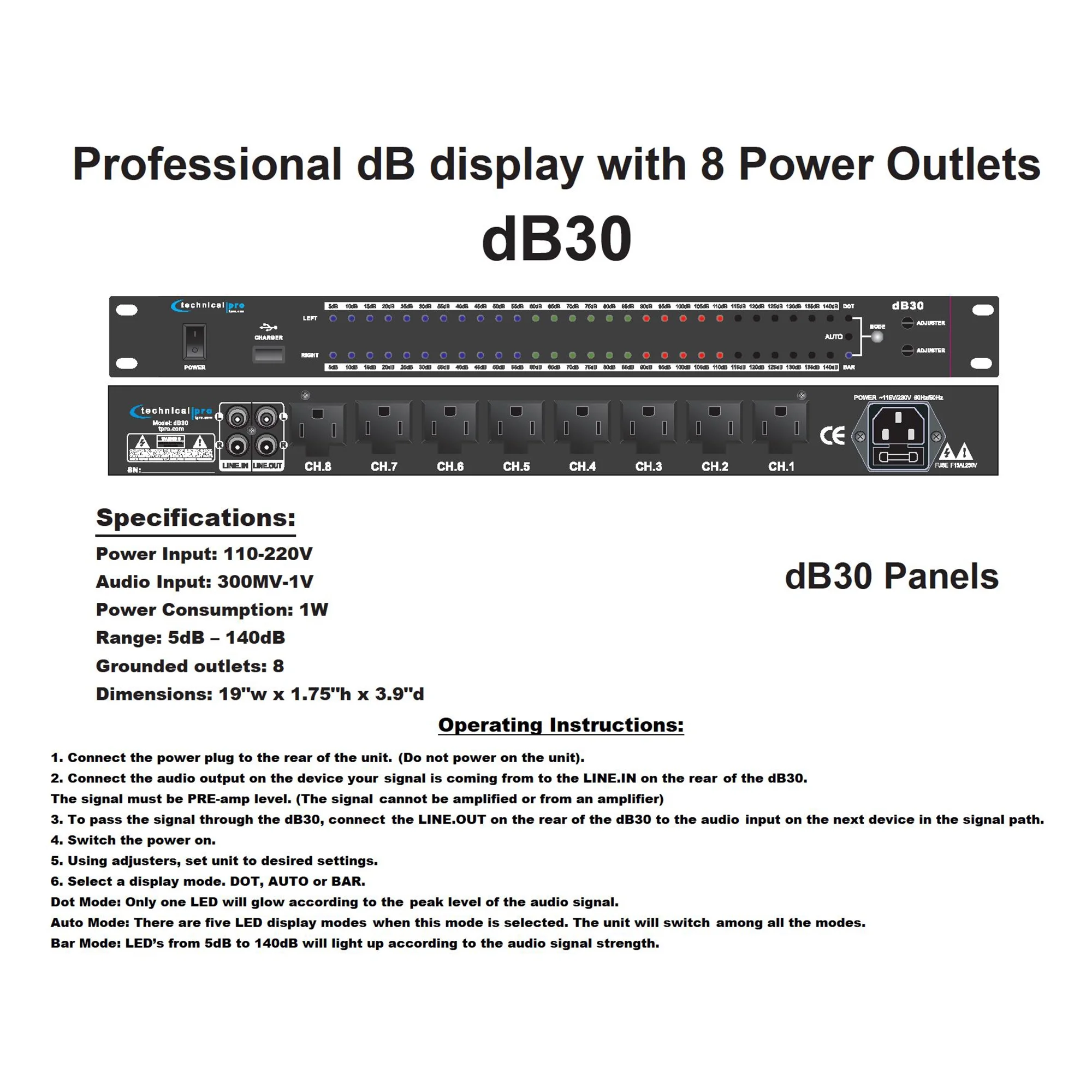 - Technical Pro DB30 1U Rack Mount Decibel Meter Display Plus 8 Outlet Power Supply