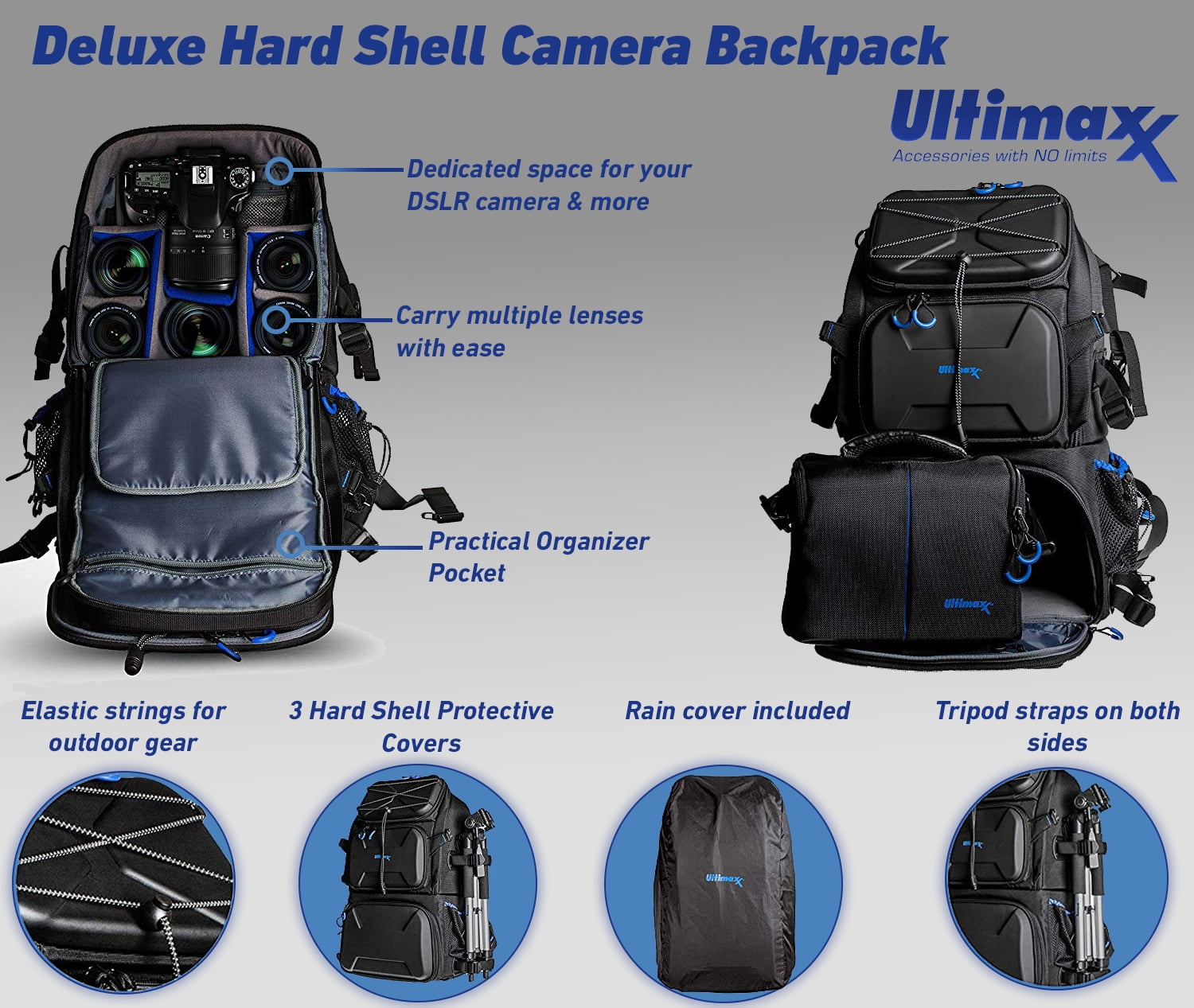 Ultimaxx Heavy Duty Professional Deluxe Camera Backpack with 3 Hard Shell Armored Front Panels, Rain Cover & So Much More