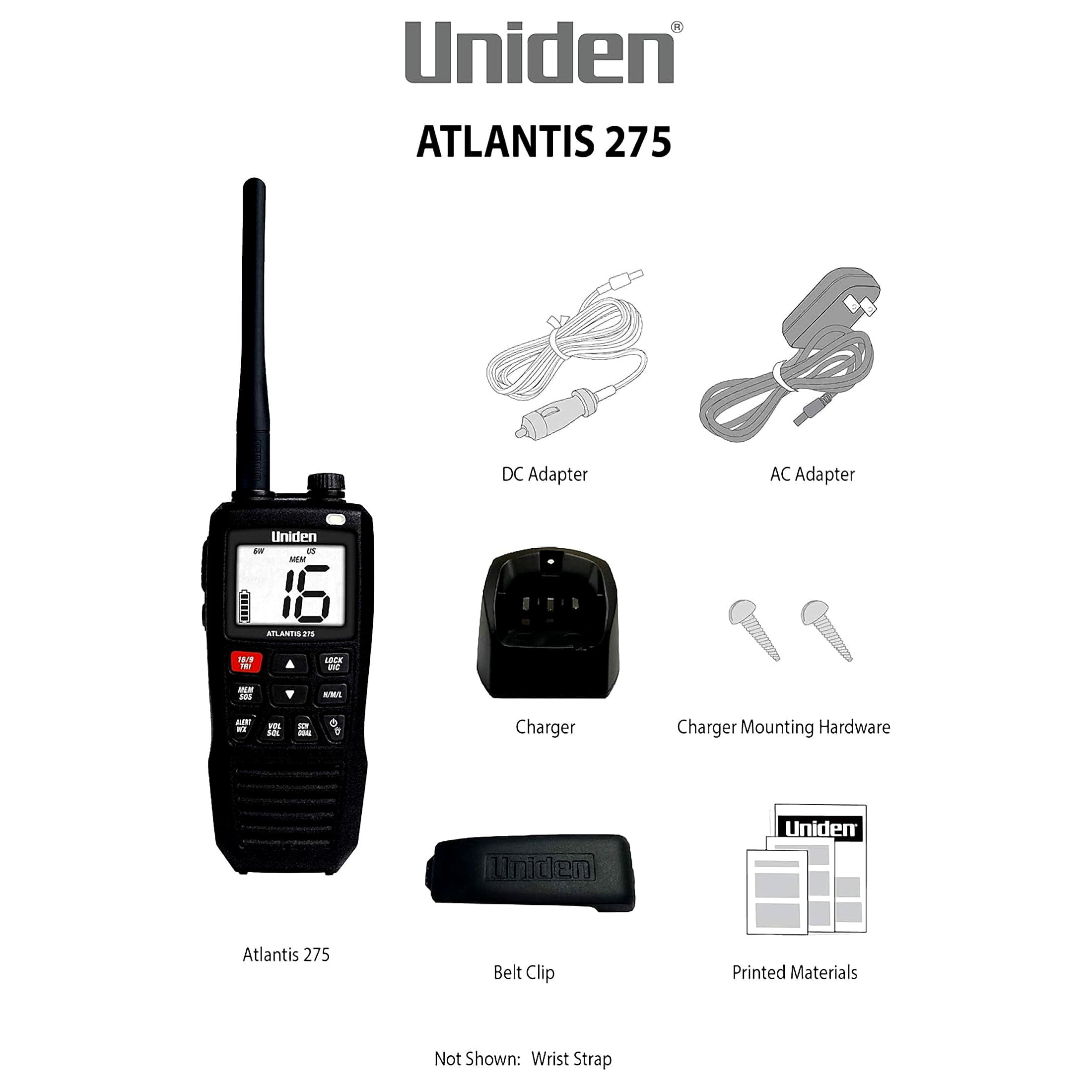$117.55The Uniden Atlantis 275 Floating Handheld 2-Way VHF Marine Radio features all NOAA emergency weather channels, as well as all USA, International, and Canadian marine channels. It also meets IPX8 submersible waterproof standards and provides big-ocean power in a compact day-at-the-lake size. The Atlantis 275 brilliant, backlit LCD display makes it easy to use, day or night, for the power to go anywhere. And because you never know when a nice day on deck might turn into a quick dunk in the water, it’s been designed to be a radio that’s comfortable with both scenarios. The Atlantis 275 is equipped with 6 watts of power to be your lifeline to information and communication that keeps you safe at sea. Built to throw in your pocket or tuck away on deck, this floating VHF marine radio is easily within reach throughout it all.