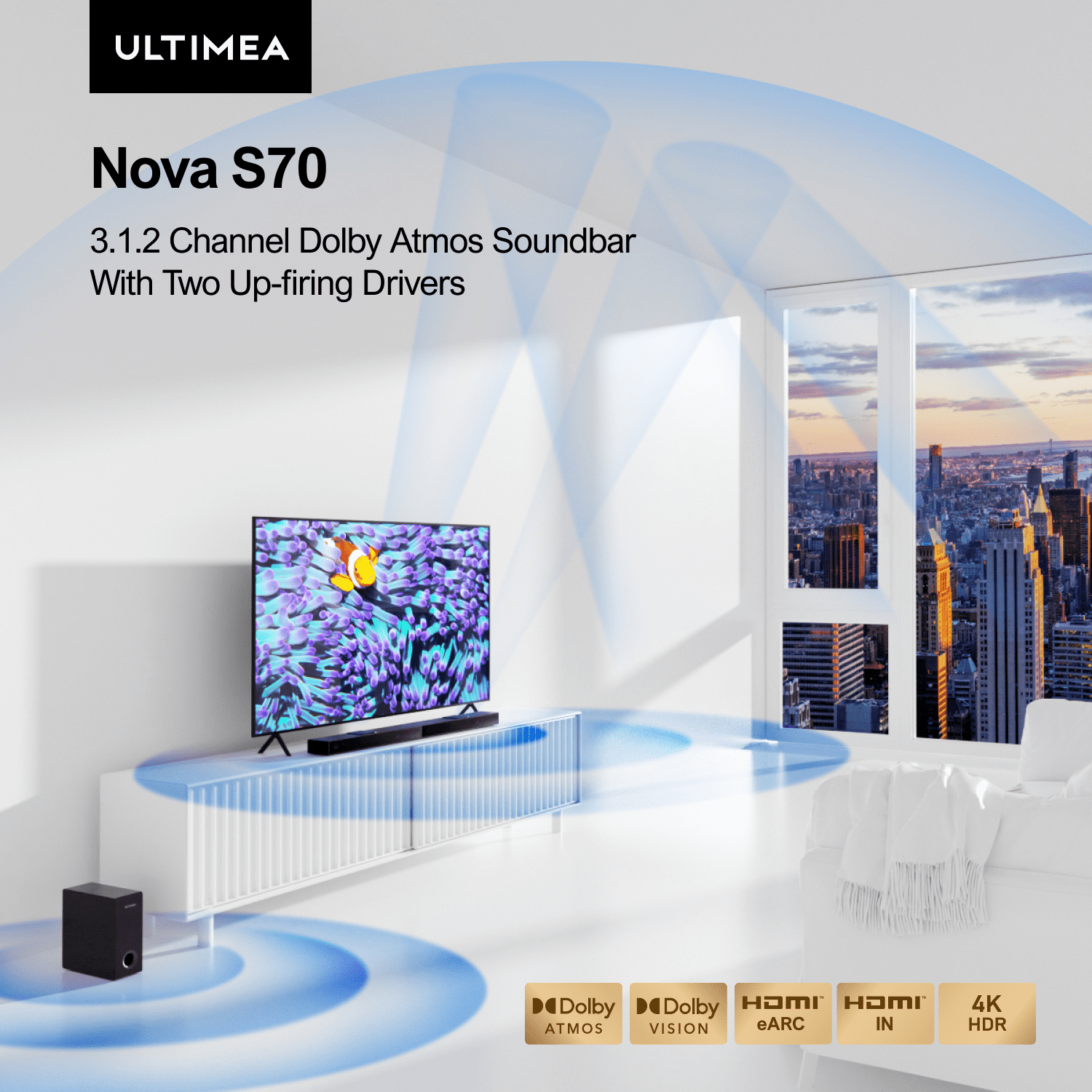 ULTIMEA 3.1.2ch Dolby Atmos Sound Bar for TV, 2 Up-firing Drivers, 390W Peak Power Soundbar with Subwoofer, 4K Dolby Vision HDR Pass-through, Bass Boost, HDMI IN/eARC, Ultra-Slim Series Nova S70, 2024