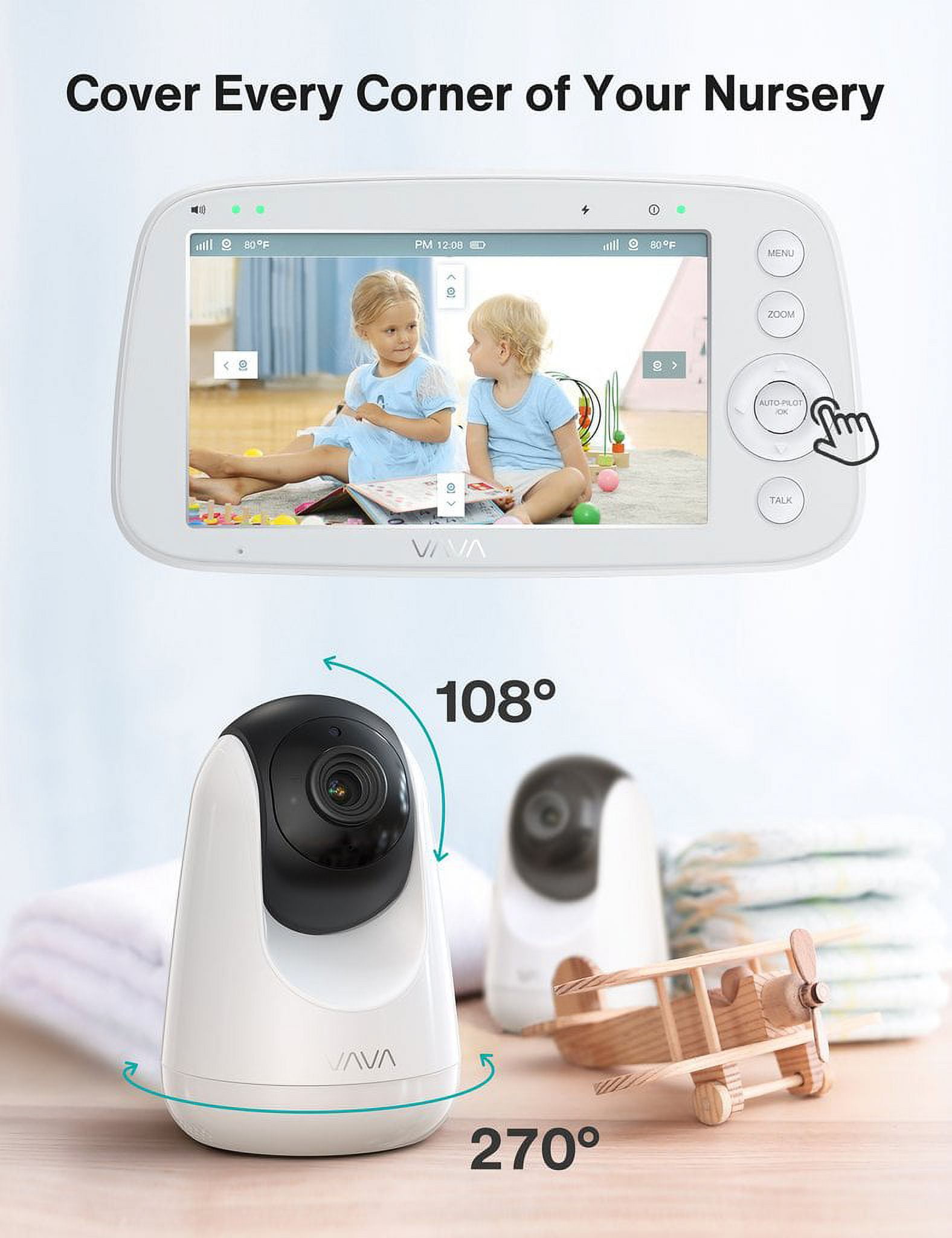 $116.06Enjoy an uninterrupted and hack-free monitoring experience with a enhanced clarity and detail with the VAVA 720P 5.5” Video Baby Monitor. The rechargeable 5.5-inch 720p screen provides an expansive view, allowing you to observe your baby with ease. With an impressive transmission range of up to 900 feet, you can stay connected no matter where you are in your home. The built-in two-way audio communication feature lets you talk to your baby from a distance, offering comfort and reassurance. Smart IR night vision technology ensures you never miss a moment, even in complete darkness, as it automatically switches to night mode for clear visibility. Adjustable camera angles give you the flexibility to find the perfect viewing position. Real-time audio and video monitoring, along with instant zoom with 2X-4X Zoom, ensures you capture every precious moment.