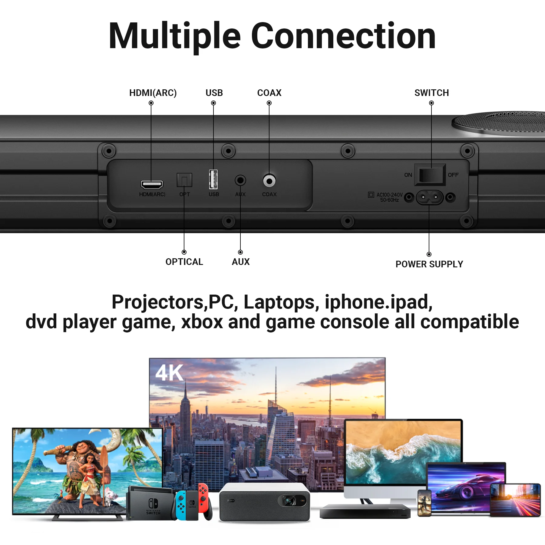 $171.99Original price was: $171.99.$68.79Current price is: $68.79.🔊Upgrade Your Home Theater & Enhances Your TV Sound The soundbar creates incredible room-filling surround sound that easily beats anything you hear from your TV’s small speakers.Experience rich, detailed sound with our sound bar speakers, immersing you in every scene with a full-range stereo experience. Our surround sound technology transports you to the heart of your favorite movies. 🎶Richness of Surround Sound Envelops You Let the captivating embrace of surround sound transport you into a world where every audio nuance comes to life, enveloping you in an immersive auditory experience.transporting you deep into the heart of every scene with unparalleled audio depth and clarity. 📈Effortless Operation, Enhanced Experience The soundbar offers versatile placement options, allowing it to be placed on a tabletop, wall-mounted ⏫House-shaking bass Paired with the sound bar, the included 120W subwoofer reproduces deep bass impact you can feel, creating a room-filling and immersive home theater and music listening experience. ⚡ Stream Wireless Music Built-in Bluetooth technology lets you stream music directly from your smartphone, tablet or other compatible device.