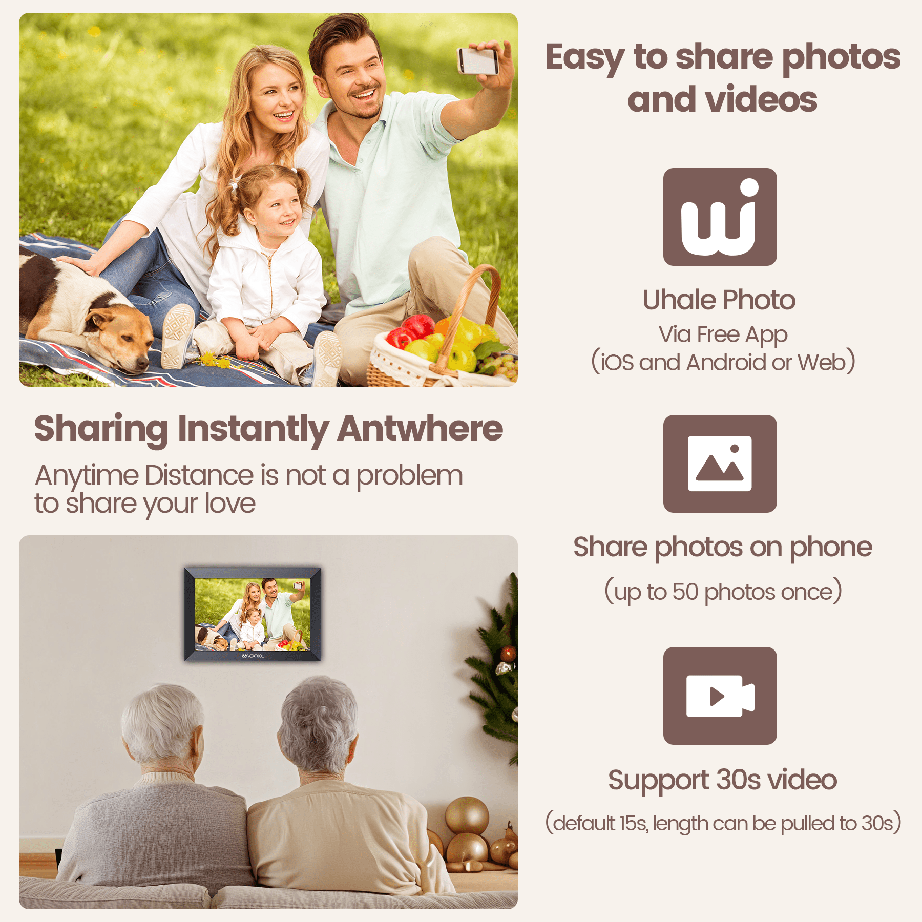 $257.99Original price was: $257.99.$46.43Current price is: $46.43.VEAT00L 10.1 Inch IPS Digital Picture Frame Why Choose VEAT00L? VEAT00L digital photo frames are always popular on market and trusted by many families. Committed to high-quality materials and the most reliable service, bringing everyone a fantastic shopping journey. 1080P Stunning Viewing Experience Equipped with 1280*800 high resolution and 178° wide view angle, the digital frame delivers such admirable visuals. Share Photos and Videos You can share photos and videos via a SD card, a USB drive,PC Uhale web and the Uhale app (available for IOS and Android systems, downloaded from Google Play or App Store for free).