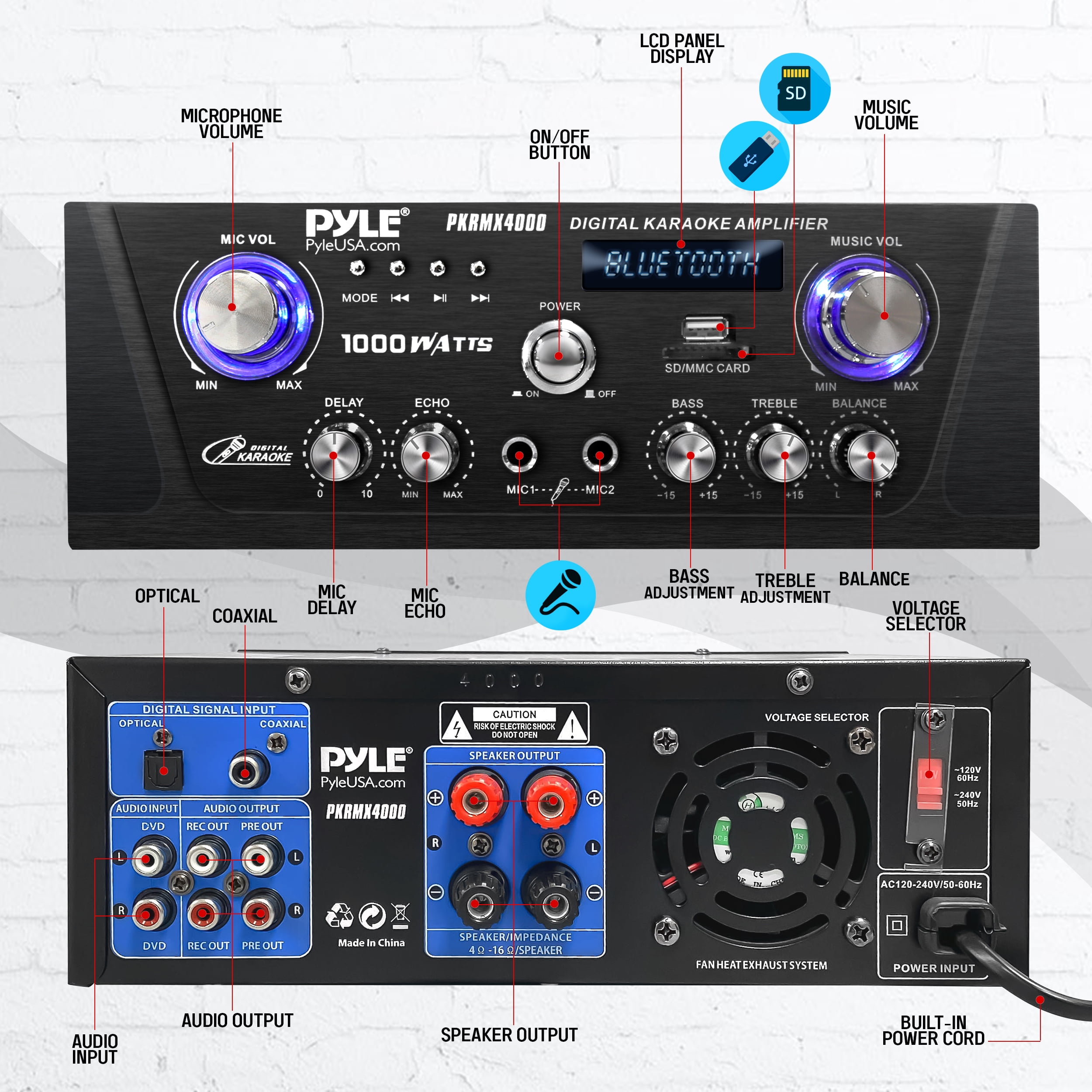 $174.575.2 Channel Receiver System – AV (Audio/Video) Stereo Amplifier – Hi-Fi Home Theater Surround Sound – Built-in Bluetooth Wireless Audio Streaming – Next-Gen Audio DSP Sound Processing Technology – 4K Ultra HD TV Pass-Through Support – 3D Video & Blu-Ray Video Pass-Through Support – Digital Dynamic, VFD Display with AM/FM Radio – Connect & Stream Audio from External Devices – MP3 Digital Audio Support – USB Flash Drive Reader – Connection Interface: (2) IN, (1) OUT x HD, Speaker Binding Posts, Optical / COAX Digital Audio – HDMI Output + Dedicated RCA Subwoofer Output – (2) 1/4’’ -inch Microphone Inputs – Independent Input Source Selection – Digital Graphic Audio Output Level Display – Mic Echo, Bass, Treble, Volume Control Adjustment – Over Current, Short Circuit, and Over Voltage Protection