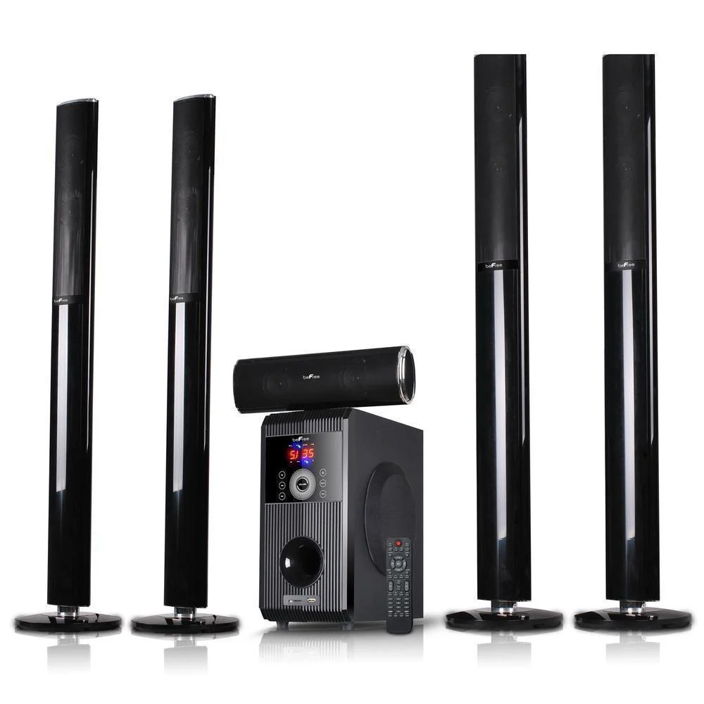 $197.79beFree sound stand alone Speaker System with Digital FM Radio features built-in 4 high powered speaker system, total output power: 100W+18W. Volume control and digital PLL FM radio. Accessories and features included: remote control and bluetooth technology * 1 5.25″ amplifier5 + 5 3″ speakers * Output power:50W+15W x5 * Unit option: 6.5″+3″ x5 * Output power:100W+18W x5 * Frequency response: 40Hz-20KHz * Separation: ≧50dB * S/N Ration:≧75dB * USB/SD inputs * FM radio * Remote control * Bluetooth technology Item Dimensions: 3.00″ x 3.50″ x 45.50″ Item Weight: 20.00lbs