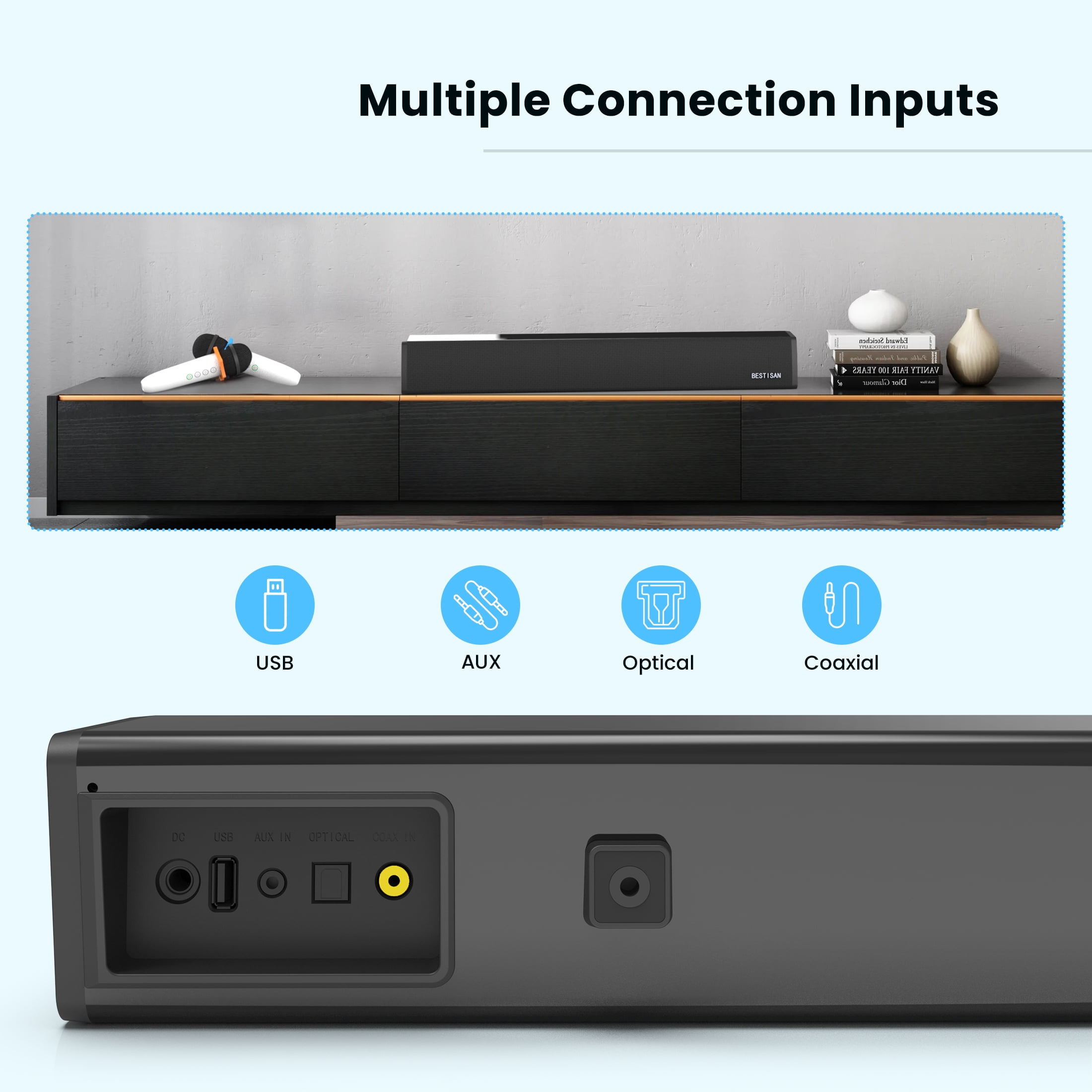 $111.79Enhanced Sound Experience: Immerse yourself in superior sound quality with our newly designed sound bar, featuring two wireless microphones for crystal-clear vocals in live performances and studio recordings. Customizable Sound Modes: Fine-tune your audio experience with seven equalizer modes, including Conference, Theater, Karaoke, and more. Use the remote control to optimize sound for your preferred content or song. Cutting-Edge Connectivity: Experience the most stable transmission with Bluetooth 5.0, allowing fast and reliable connectivity up to 30ft. The advanced Dual DSP technology ensures clarity and precision for an unmatched audio experience. Versatile Input Options: Connect wirelessly via Bluetooth or use Aux/USB/Coaxial and Optical cables for a wired connection to your TV, PC, or phone. Enjoy flexible setup options – place it on a surface or mount it on the wall with included kits. Fun for All Ages: Elevate your entertainment with optimized sound for various content, from Theater and KTV to POP and Studio. This sound bar, equipped with two microphones, makes for a unique and enjoyable gift for both children and adults alike. WARM TIPS: Before starting singing, Please make sure the microphone and soundbar are matched successfully. After pairing, don’t put the microphone too close to the soundbar, or it will make a harsh sound. Bestisan offers comprehensive technical support and one year guarantee for this sound bar, any questions, pls contact support email. Fast Mic-Soundbar Setup Guide 1, Press and hold the volume+/- buttons on both microphones simultaneously after turning them on to initiate quick flashing LEDs. 2, Power on the soundbar, allow 3-5 seconds for automatic pairing with the microphones, then press the power button on both microphones to stop LED flashing. 3, Confirm successful pairing by speaking into the microphone; if the soundbar amplifies your voice, pairing is complete. 4, Easily switch the soundbar mode to connect with different devices. Package Included: 1×Power adapter 1×Digital optical cable 1×RCA to 3.5mm Cable 1×Remote control 1×User manual 1×Wall mount kit with template 2×Karaoke Wireless Microphone