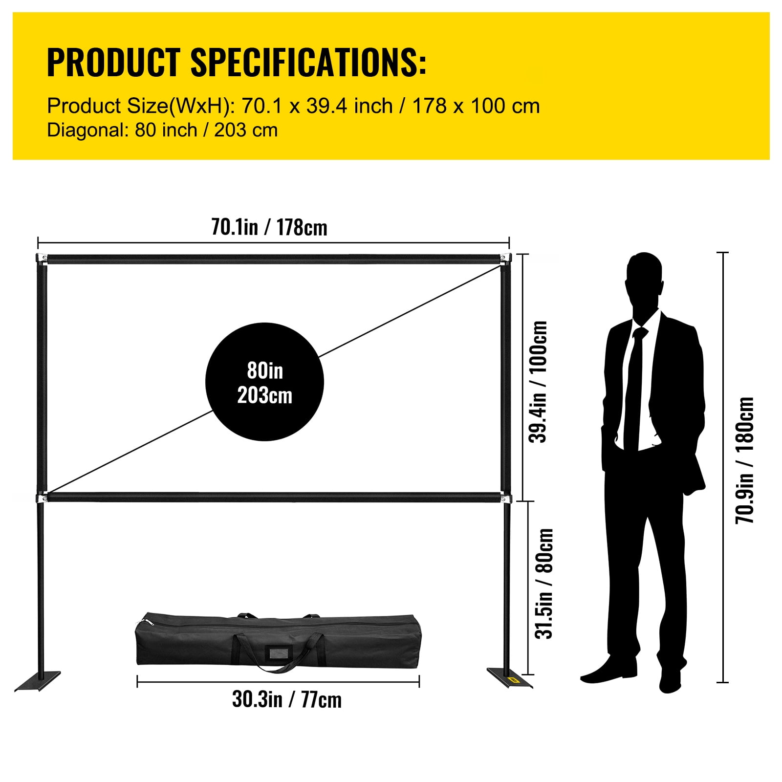 $74.61Product Description 80″ Outdoor Movie Screen w/ Stand The movie screen for outdoor use features 16:9 high definition and a 160-degree wide viewing angle. The upgraded high-textile oxford cloth can get better photosynthesis and more clearer projection. It’s easy to install and portable anywhere. You can enjoy movable cinema at home, outdoor, hotel, ceremony, etc. Specifications Screen Material: High-textile Oxford Cloth Stand Material: 6061 Aluminum + 45# Steel Diagonal: 80″ / 203.2 cm Aspect Ratio: 16:9 Viewing Angle: 160 Degree Screen Size:71 x 45″ / 180.34 x 114.3 cm Unfolded Height: 71″ / 180.34 cm Storage Pouch Length:30.3″ / 76.96 cm Package Content 1 x Projector Screen 1 x Storage Pouch 2 x Base 8 x Aluminum Alloy Tubes 8 x Ground nails 4 x Ropes 1 x Needle & Thread Set 1 x Manual