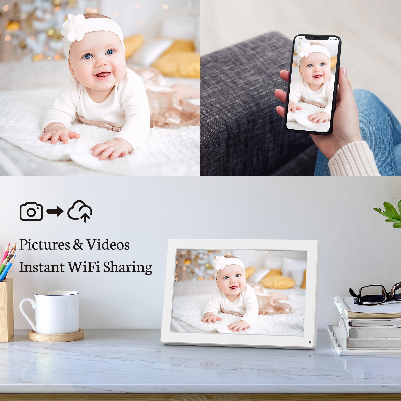 BSIMB 32GB 10.1 inch Digital Photo Frame with HD IPS Touch Screen, Motion Sensor, Auto-Rotated, Wall-Mounted, Sharing Photos/Videos via App Email, White, Gift for Grandparents